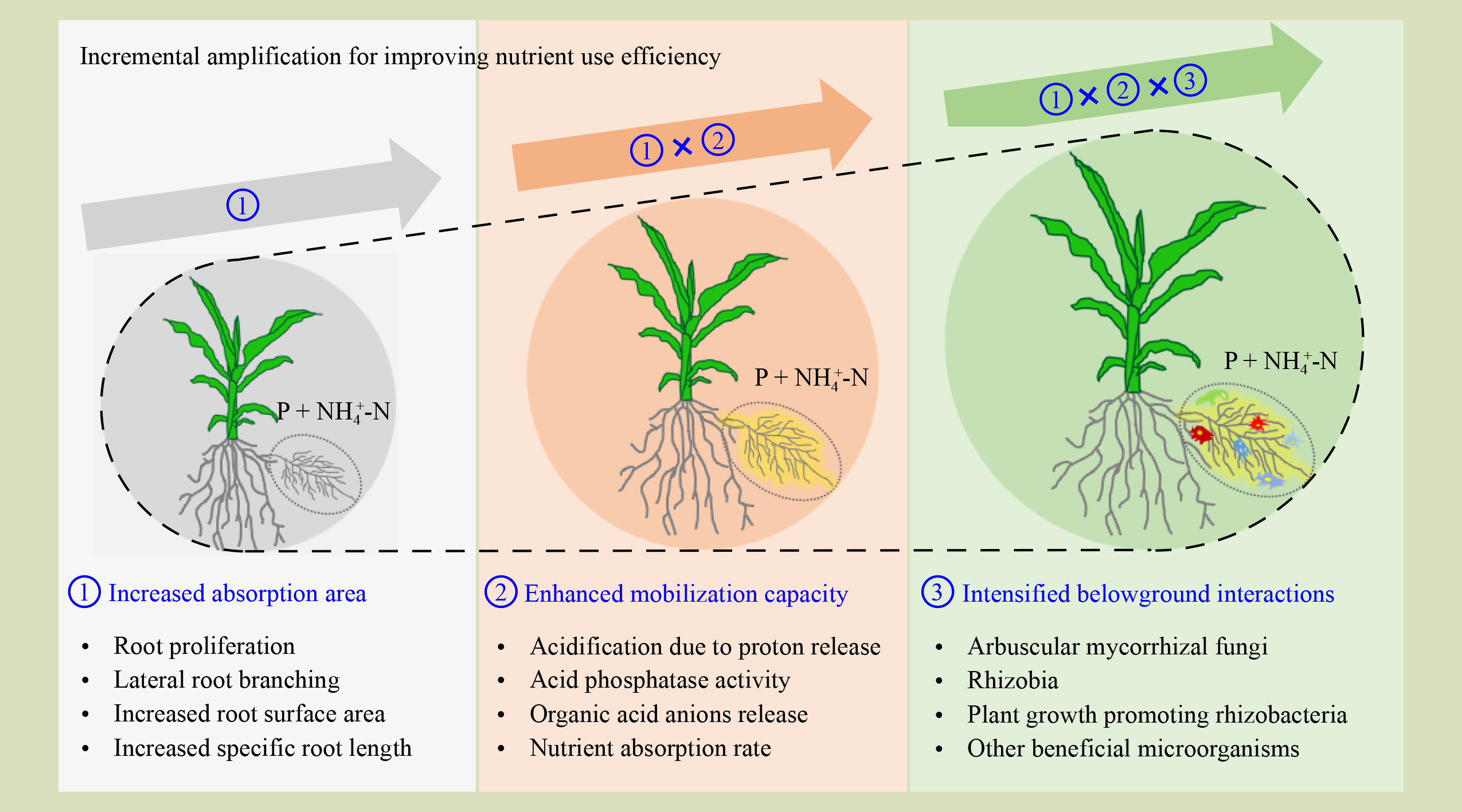 Localized fertilization strategies (banding fertilizers) developed to minimize nutrient fixation by soil are used widely in intensive agricultural production. Localized fertilization encourages root foraging for heterogeneously distributed soil nutrients. This review focuses on the advances in root growth and nutrient acquisition of heterogeneously distributed soil resources. It is proposed that the incremental amplification of root foraging for nutrients induced by localized fertilization: (1) increased absorption area due to altered root morphology, (2) enhanced mobilization capacity underpinned by enhanced root physiological processes, and (3) intensified belowground interactions due to selective stimulation of soil microorganisms. The increase in root proliferation and the nutrient mobilization capacity as well as microbiome changes caused by localized fertilization can be amplified stepwise to synergistically enhance root foraging capacity, nutrient use efficiency and improve crop productivity. Engineering the roots/rhizosphere through localized, tailored nutrient application to stimulate nature-based root foraging for heterogeneously distributed soil nutrients, and scaling up of the root foraging capacity and nutrient acquisition efficiency from the rhizosphere to the field offers a potential pathway for green and sustainable intensification of agriculture.