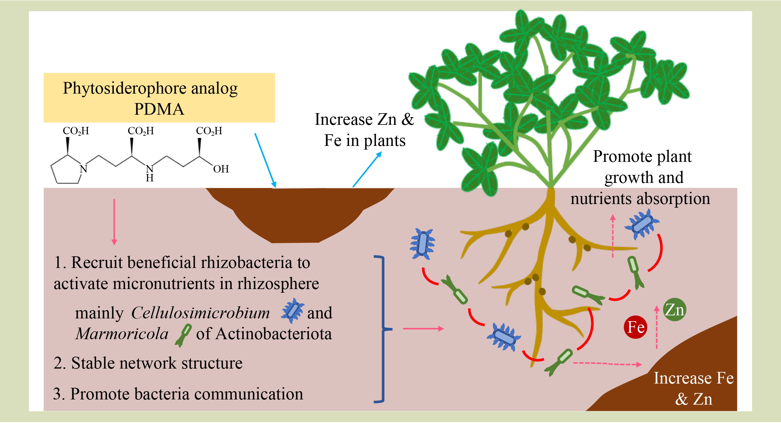 2′-Deoxymugineic (DMA), a phytosiderophore secreted by Poaceae species, can improve iron nutrition in plants. However, little is known about how DMA influences beneficial bacteria in rhizosphere microecosystem. To address this gap, the DMA analog proline-2′-deoxymugineic (PDMA) was used to evaluate its positive effect on peanut rhizobacterial communities and network structure. This study demonstrated that PDMA can promote the absorption of several mineral nutrients in plants and activate micronutrients in the rhizosphere. Specifically, PDMA led to significant impact on the bacterial community structure in the peanut rhizosphere, resulting in a substantial increase in the relative abundance of Actinobacteriota with six beneficial rhizobacterial genera in this phylum. The Cellulosimicrobium and Marmoricola of Actinobacteriota recruited by PDMA may enhance micronutrient availability both to peanut plants and in soil. PDMA application led to the development of a tight, stable microbial network, as indicated by higher topological parameters and a greater variety of keystone genera. Functional prediction revealed that PDMA fosters microbial communication in the rhizosphere. Overall, PDMA was shown to recruit beneficial bacteria and to modulate bacterial network structure in the peanut rhizosphere. It is concluded that these findings demonstrate that phytosiderophore might promote plant growth and nutrition absorption by regulating plant–soil microecosystem.