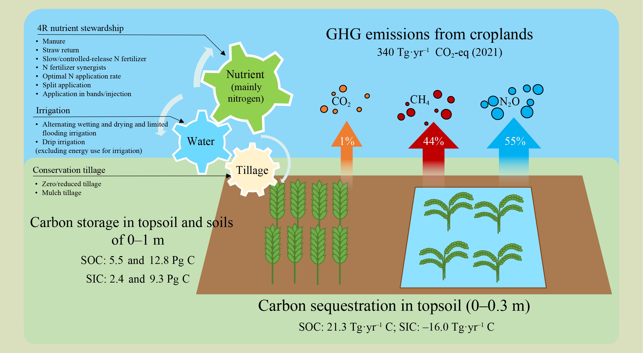 Crop production is strategic for food security and climate change mitigation, and can provide a temporary soil carbon sink. There is an ongoing debate about how to optimize crop production in China toward carbon-neutral agriculture. This paper summarizes major carbon budgets in staple crop production in China over recent decades, synthesize reported impacts of available and developing field management practices on greenhouse gas emissions reduction and carbon sink increase. According to recent studies, cropland-based GHG emissions (55% N2O and 44% CH4) increased at a rate of 4.3 Tg·yr–1 CO2-eq from 1990 to 2015 and peaked at 400 Tg CO2-eq in 2015. Subsequently, there was a substantial decrease of 11.6 Tg·yr–1 CO2-eq between 2015 and 2021. A similar bell-shape trend has been observed in yield-scaled GHG emission intensity over the years for cereals excluding rice, as rice exhibited a steady decline in yield-scaled emission intensity since 1961. For soil C in Chinese cropland, topsoil C represents a huge C pool, containing 5.5 Pg of soil organic carbon (SOC) and 2.4 Pg of soil inorganic carbon (SIC). However, these densities are relatively low globally, indicating a high C sequestration potential. Soil C in cropland has been a weak sink of 5.3 Tg·yr–1 C in China since the 1980s, resulting from the net effect of SOC sequestration (21.3 Tg·yr–1 C) and SIC loss (–16 Tg·yr–1 C), which only offsets 5.7% of simultaneous cropland GHG emissions. Hence, cropland remains consistent and significant GHG sources, even when considering soil C sequestration and excluding related industrial and energy sectors. Fortunately, many reliable management practices have positive effects on emission intensity of crop production, in terms of fertilizer application, irrigation and tillage. However, the path to achieving carbon neutrality in China’s cropland is still uncertain and requires further quantitative assessment. Nonetheless, this synthesis highlights that the huge potential, and strong scientific and technical support in low-carbon crop production, for modifying China’s food system.
