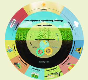 This image depicts productive, sustainable, and resilient maize production systems. The multi-element outer cycle represents maize’s production environment: the upper arc signifies the atmospheric environment (solar radiation, temperature, precipitation), requiring cropping systems to maximize light and temperature utilization for achieving local yield potential. The lower arc illustrates the whole-process smart and precision management from tillage to harvest, integrating green inputs, intelligent agricultural machinery, and information technologies, forming th [Detail] ...