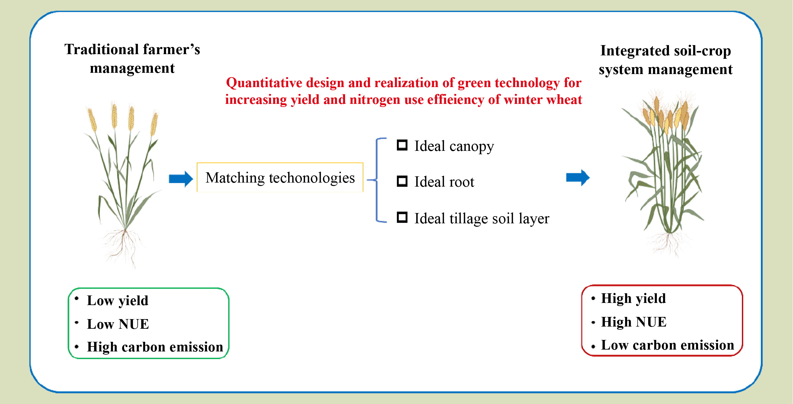 The development of green technologies for improving winter wheat yield and nitrogen use efficiency (NUE) is crucial for ensuring national food security and reducing carbon footprint. This study outlines China wheat yield progress and establishes a three-stage theory for this. The key constraints from a soil-crop system perspective were identified: population-individual competition, dry matter accumulation and distribution, and soil quality degradation. To address these constraints, an optimized soil-crop system is proposed. (1) Adopting rational dense planting using optimal densities of 330–375 plants m−2 for large-spike cultivars and 225–270 plants m−2 for medium-spike cultivars to establish robust populations. (2) Enhancing soil quality and reducing carbon footprint by the adoption of straw return combined with a strategy of deep plowing and rotary tillage to improve soil fertility quality, reducing carbon footprint by 1.87 Mg CO2 eqv ha−1. (3) Using wide-space drill sowing of 6–8 cm sowing belts to minimize interplant competition, coupled with moderate density to stimulate deep-root nitrogen uptake. (4) Optimizing the canopy optimization by delayed sowing (mid-October to early-November) combined with density adjustment enhances light interception efficiency. This integrated soil-crop system management demonstrates long-term effectiveness, increasing grain yield, NUE and reducing carbon footprint. These findings provide practical solutions for green and efficient production of winter wheat.