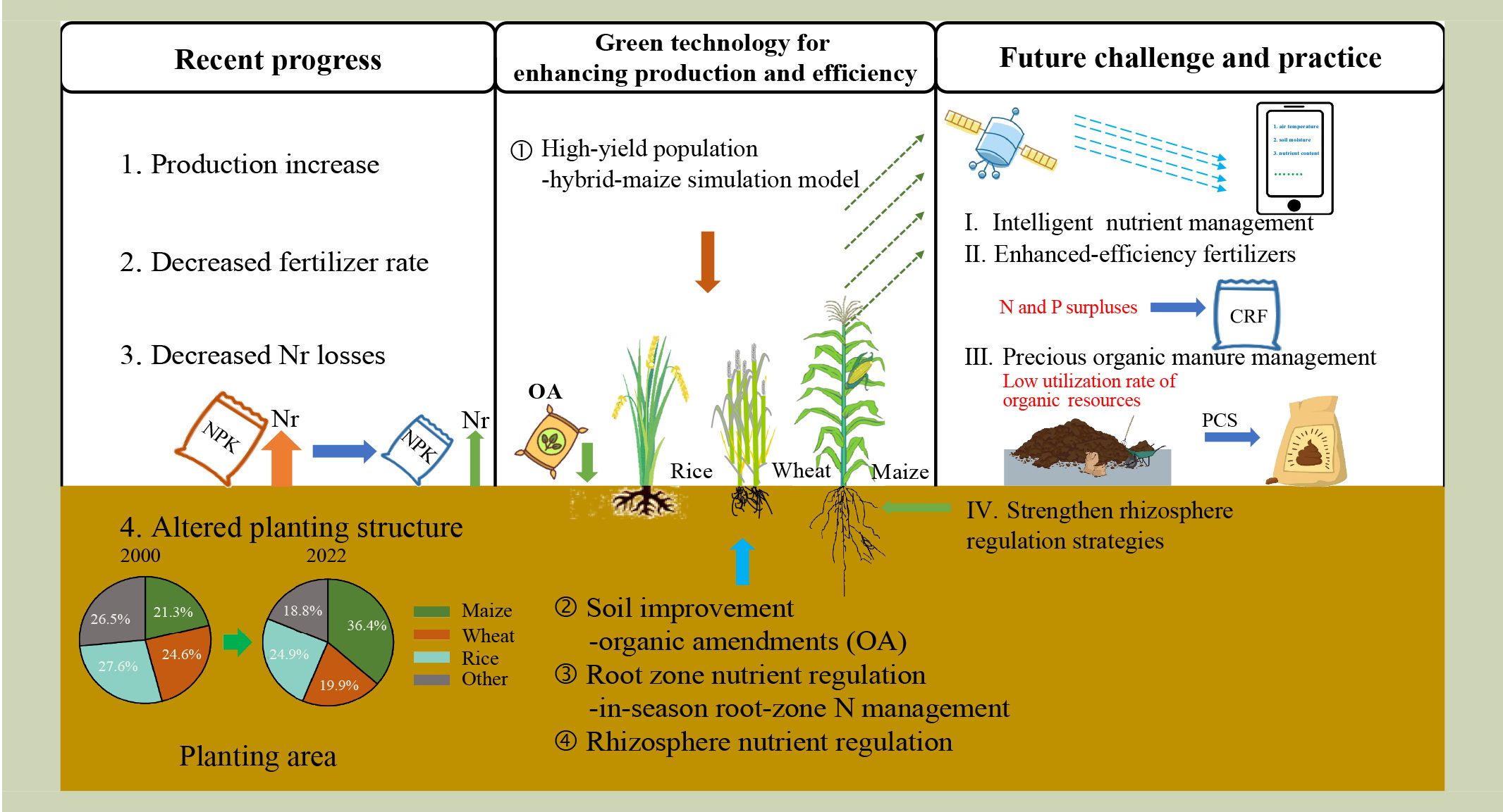 The implementation of green technologies has facilitated the sustainable development of China’s agriculture. However, the impact of green technologies in China’s major crops production, their mechanisms of action and their future potential have not been systematically investigated. This study used national statistics data to summarize the impact of technological innovation on production and efficiency of major grain crops in China, and to identify which technologies have made the most important contributions. National statistics data showed changes in grain production (58% increase), total planting area (8.6% increase) and structure, nutrient input (0.83 Mt decrease) and reactive nitrogen losses, and optimized planting and fertilizer structure in 2022 compared to 2000. Of these, the proposal of integrated soil-crop system management significantly decreased reactive nitrogen losses and greenhouse gas emissions by 30% and 11%, respectively. Root zone nutrient regulation techniques, such as in-season nitrogen management, increased yields by 8% and decreased nitrogen rate by 25%. Rhizosphere nutrient regulation technology increased yield by 20.2% and decreased nitrogen rate by 20%–30%. According to predictions, integrated soil-crop system management will demonstrate significant advantages in both unit area yield and total yield by the year 2050. The adoption of integrated soil-crop system management is expected to increase the total production of rice, wheat and maize by 45.8, 115 and 360 Mt, respectively. Currently, China’s agriculture is confronted by significant challenges, including rising food demand, excessive inorganic nutrient inputs, and low utilization rates of organic resources. Three key recommendations arise from this study: the implementation of precise management for organic manure; the promotion of enhanced-efficiency fertilizers; and the adoption of new technologies including integrated soil-crop system management combined with rhizosphere nutrient regulation and intelligent nutrient management. These measures will drive the development of green, high-yield and efficient agriculture.