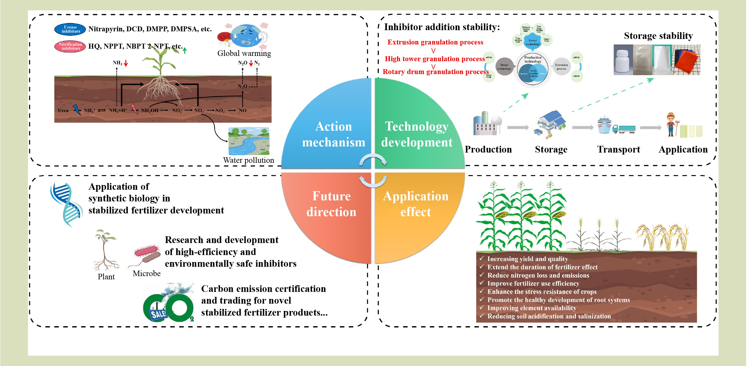 Stabilized fertilizers, enhanced with urease or nitrification inhibitors, have emerged as pivotal tools for China’s agricultural green transition, balancing crop productivity, resource efficiency, and environmental sustainability. Globally, Germany and other EU countries have pioneered inhibitor-integrated fertilizer policies, driving emission reductions. Despite China’s later start, breakthroughs in local production, diversified formulations (covering six major fertilizer categories) and standardized systems have positioned it as a global leader, with 90% of the raw material capacity and 3 Mt annual output (4% of the total fertilizer production). Meta-analysis of over 900 trials (2014–2018) demonstrates stabilized fertilizers increase yields by 9.2%, nitrogen use efficiency by 11.2% and lower N2O emissions by 28.4% in staple crops. Field studies further reveal multifunctional benefits including 60% higher nitrogen efficiency, 60% emission cuts, 20%–50% fertilizer savings and enhanced climate resilience. To maximize impact, advancing technology innovation, refining application protocols and fostering cross-sector collaboration are critical. This paper provides strategic insights to accelerate China’s sustainable agriculture transition and global climate goals.