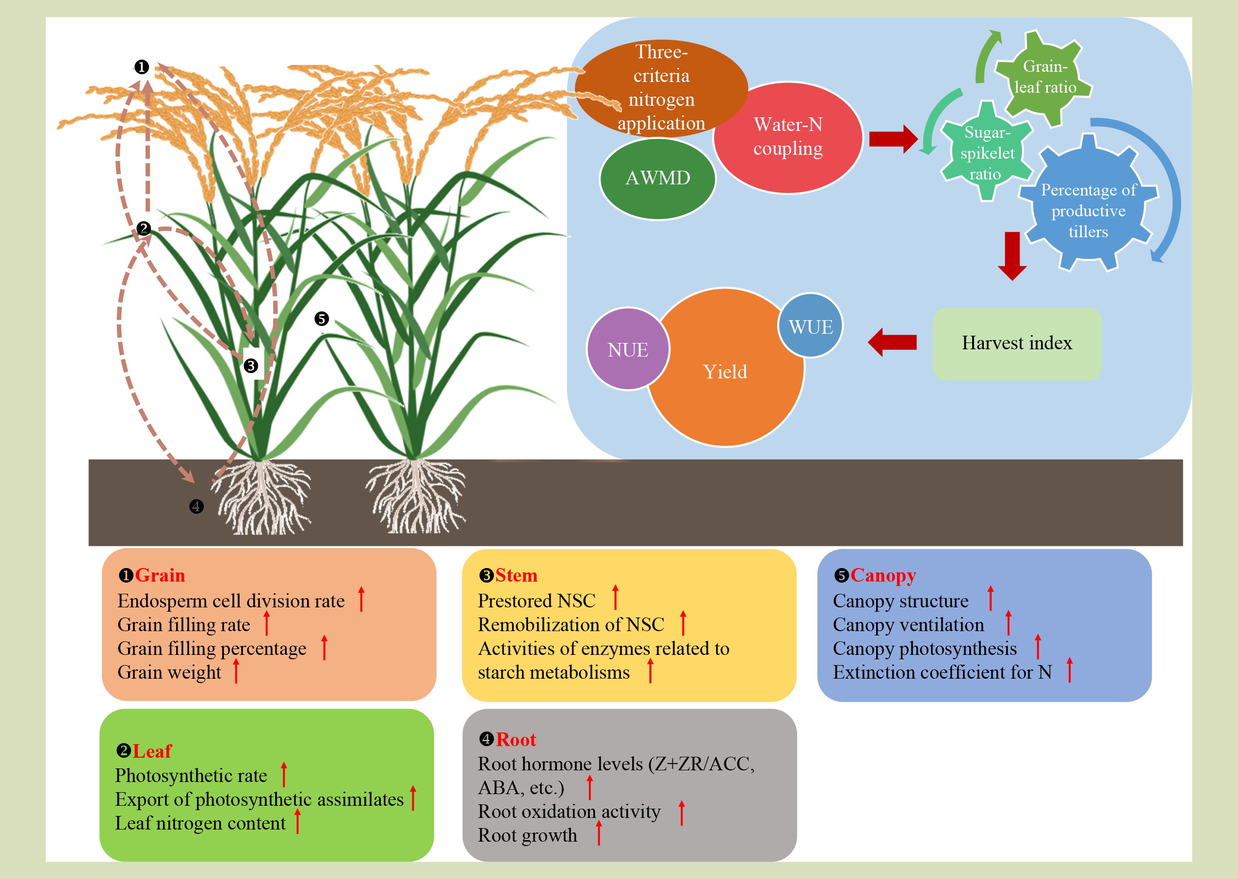 Rice is the staple food of nearly half the global population, and its production must steadily increase to meet the growing demand driven by an increasing global population. While an increase in rice production heavily relies on substantial water and fertilizer inputs, which not only decreases water and fertilizer use efficiencies, but also pose significant environmental risks. Therefore, it is an urgent need to enhance yield and resource use efficiency through the development and adoption of innovative, sustainable and environmentally-friendly technologies. This paper reviews progress in green rice production over recent decades based mainly on such research. Firstly, it explores physiological strategies aimed at enhancing yield and improving resource use efficiency in rice production. Secondly, it proposes three key agronomic and physiological strategies to achieve green rice production: optimizing the grain-leaf ratio to balance source-sink dynamics, enhancing the sugar-spikelet ratio to improve sink strength and facilitate non-structural carbohydrates remobilization during grain filling, and increasing ratio of productive tillers to optimize canopy structure. Based on these strategies, a quantitative evaluation of rice population characteristics was undertaken to achieve high yield and resource use efficiency. Thirdly, green technologies for rice production is introduced, including alternate wetting-drying irrigation, three-criteria nitrogen application (based on soil, leaf color and cultivar), and water-nitrogen coupling regulation. Finally, the implication of these technologies is summarized for the major rice-growing areas in China, including Anhui, Heilongjiang, Hubei, Jiangsu, Jilin and Sichuan, and Shanghai. The future prospects for sustainable rice production is then discussed, emphasizing the potential of green technologies to meet the growing demand for rice in an environmentally sustainable way.