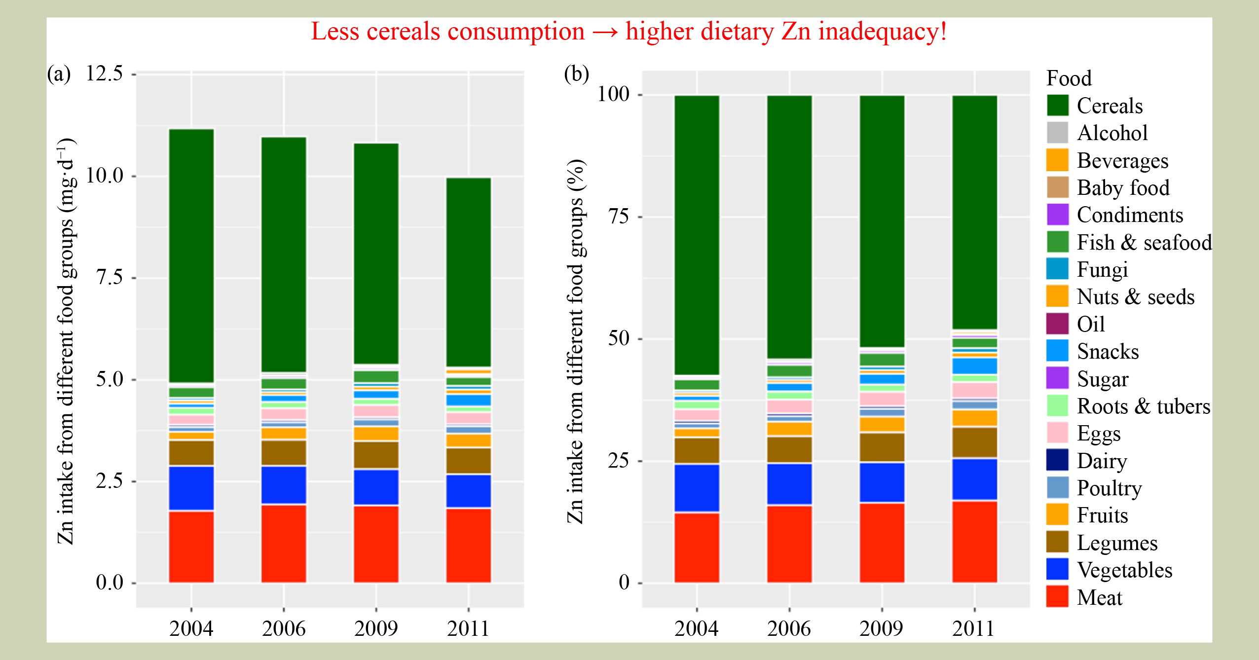 Adequate dietary zinc intake remains a public health challenge in China. Also, there is a lack of information on the relationship between Zn intake and food consumption patterns across provinces and over time. In this study, data from the China Health and Nutrition Survey 2004–2011 (21,266 individuals) was used to explore associations between dietary Zn intake and sociodemographic factors. Zn intake per person declined from 11.1 mg·d−1 in 2004 to 9.89 mg·d−1 in 2011, with reduction in cereal consumption the greatest contributor to this. However, the reduction resulting from the lower cereal consumption was only partly compensated by an increase in consumption of Zn-rich foods. The percentage of the study population with inadequate Zn intake increased from 23% in 2004 to 37% in 2011. While Zn intake was positively associated with income levels in each survey year, the time trend for all income levels was a gradually reducing Zn intake. In all years, males had an average higher dietary Zn intake, whereas no significant difference was found between living areas. In conclusion, this study shows that dietary Zn inadequacy was high and has increased over the studied period. Remediation could be sought by shifting dietary patterns toward more Zn-dense food or by enhancing Zn concentration through biofortification.