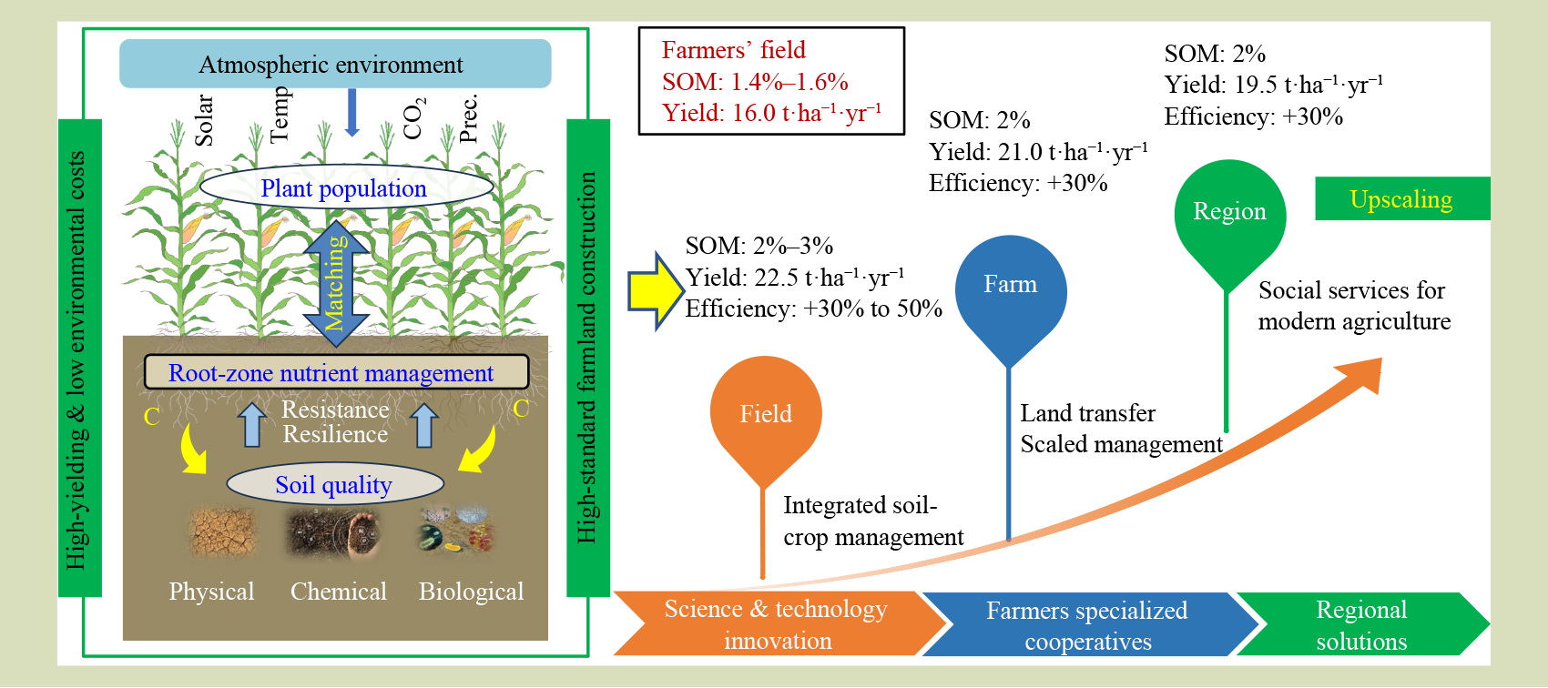 Pursuing greater crop yields with fewer inputs is a grand challenge under a changing climate, particularly for smallholder farming. Integrated soil and crop management has been proven effective in increasing both crop yield and nutrient use efficiency on a large scale in China. However, there is a lack of multi-objective and integrated technologies aimed at improving soil quality, crop yield, and nutrient and water resource efficiency, which are currently the top priorities of sustainable crop production. This paper proposes pathways for the sustainable production of 22.5 t·ha–1 yield in a winter wheat and summer maize rotation on the North China Plain. The challenges and constraints of sustainable crop production were reviewed with a focus on extreme climate events, soil quality, resource use efficiency, and socioeconomic factors. There is now increasing attention given to addressing these issues through the selection of superior crop genotypes, precision management of nutrients and irrigation, improvement of soil quality and land management. This can lead to increased yields and reduced resource inputs and can also mitigate greenhouse gas emissions and increase carbon sequestration in soils. Strengthening sustainable crop production requires a deeper understanding of plant–soil-climate-management interactions and involves interdisciplinary research innovation and multistakeholder participation, which can help achieve agricultural sustainability.