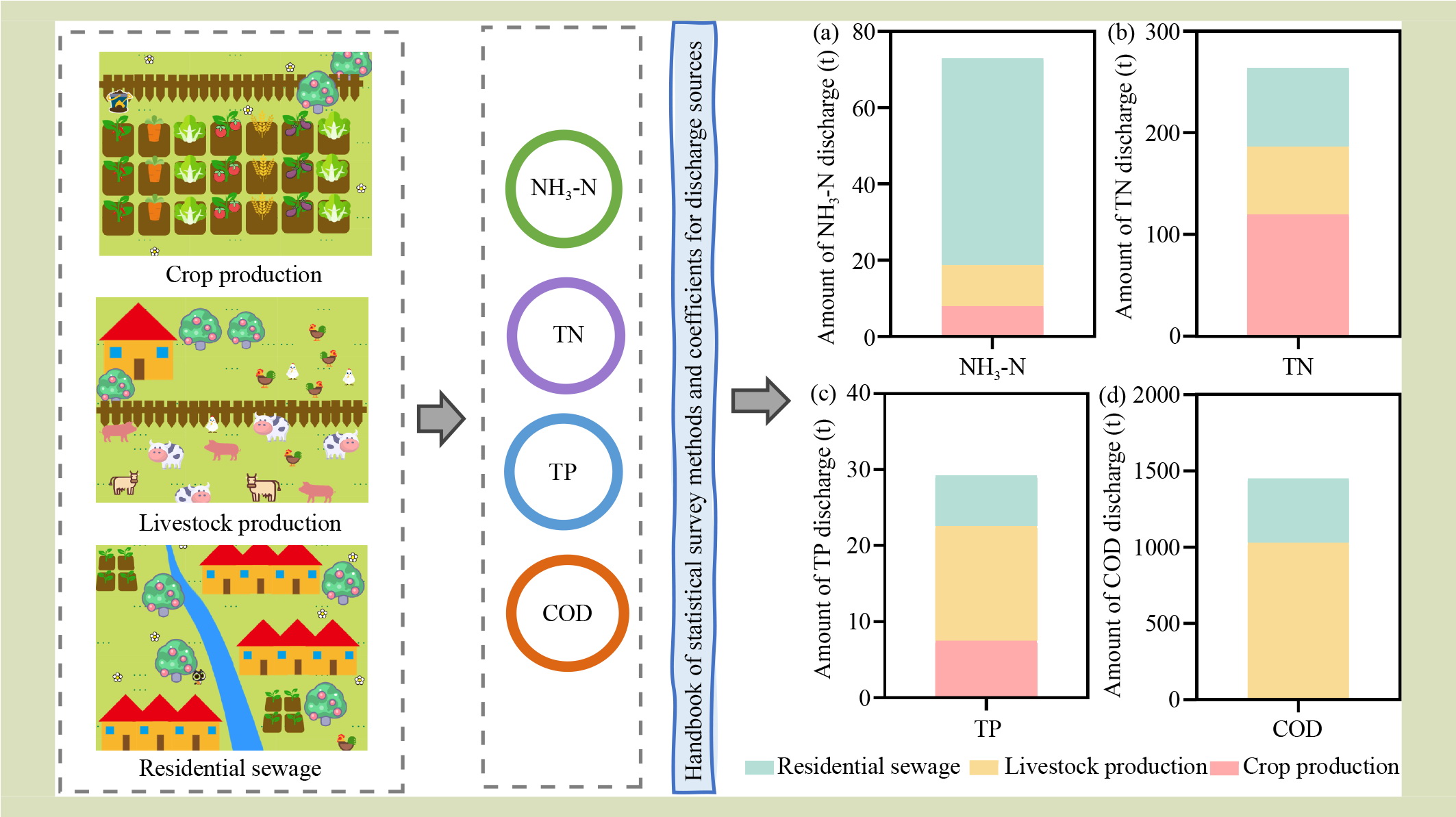 Human activities are the main contributors to non-point source pollution. Understanding the relative contributions of various sources to pollutant discharge is essential for effective water quality management. This study aimed to quantify ammonia nitrogen (NH3-N), total nitrogen (TN), total phosphorus (TP) and chemical oxygen demand (COD) to the environment from crop and livestock production, and residential sewage in the Haixi Region of the Erhai Lake Basin, south-west China, using integrated data from farmer surveys, literature reviews and statistical data. The results revealed that the NH3-N, TN, TP and COD discharges were 72.9, 264.1, 29.2, and 1453.3 t·yr−1, respectively, in 2022 in Haixi Region. Shangguan township, as a high-intensity discharge area, accounted for 21%–44% of the total discharges of four pollutants. Maize, vegetables and beans crops were the largest contributors to water pollution in Haixi Region, which are responsible for 6.3, 94.1, and 5.5 t·yr−1 of NH3-N, TN, and TP, respectively. Dairy cattle and pig rearing were the main contributors in the livestock production. Compared to crop and livestock production, NH3-N discharged from residential sewage were 186% higher, while the other three pollutants were 59%–71% lower. These findings support the refined management of agricultural activities in accordance with water quality protection policies of Erhai Lake Basin.
