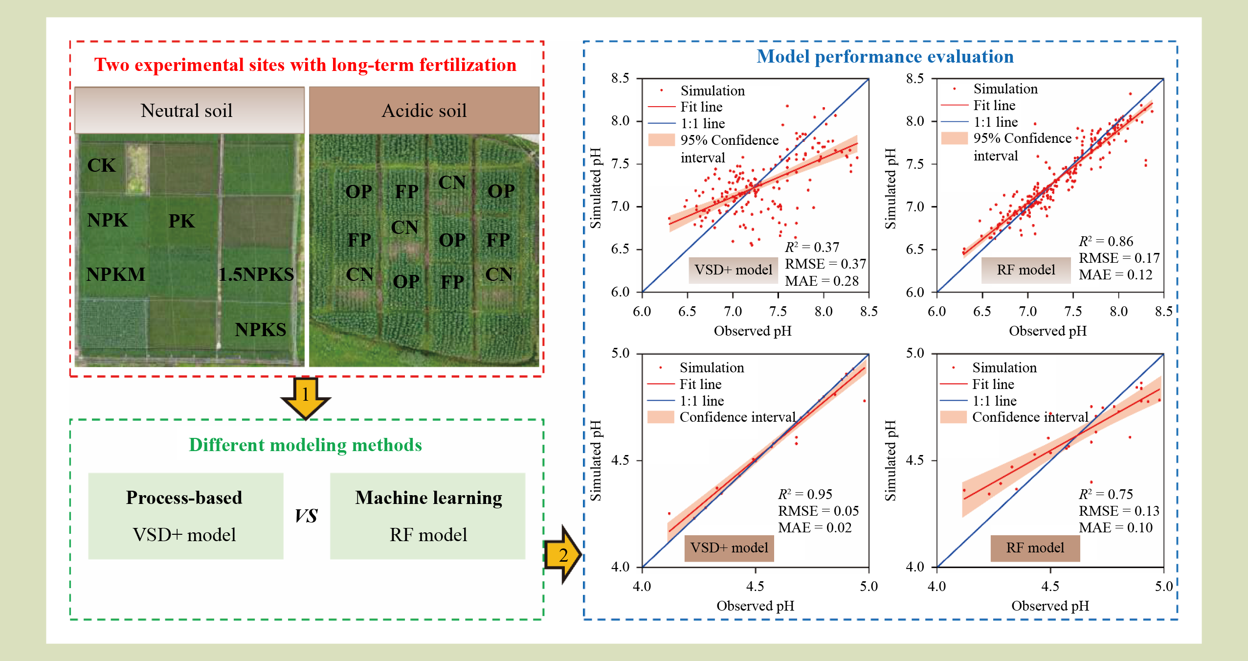 Soil acidification models are useful for evaluating measures to mitigate soil acidification under various agronomic practices. However, the appropriate modeling approaches for simulating the soil acidification process have not been adequately studied across soils with distinct buffering mechanisms. This study evaluated the performance differences between a process-based soil acidification model (VSD+) and four machine learning models, including random forest (RF), support vector machine, extreme gradient boosting and decision tree, in simulating pH dynamics of neutral and acidic soils. Two long-term experimental sites were selected with distinct buffering mechanisms on purple soil as an example for the development, calibration and validation of soil acidification models. Results from the RF importance factor analysis indicated that soil background pH was the primary factor influencing the dynamic changes in purple soil pH, followed by meteorological conditions and agronomic practices. pH was then chosen as an essential input variable to developing machine learning models for simulating soil acidification patterns. Machine learning models achieved higher accuracy in neutral soil than the VSD+ model. The RF model gave the best simulation performance, outperforming other machine learning models at both sites, with the highest R2 of 0.70 and 0.47 and the lowest MAE of 0.19 and 0.17 for neutral and acidic soils, respectively. In contrast, the VSD+ model exhibited excellent accuracy with acidic soil (R2 = 0.95, RMSE = 0.05 and MAE = 0.02) compared to the other machine learning models (R2 = 0.20–0.47, RMSE = 0.15–0.23 and MAE = 0.14–0.20). These findings provide information for selecting the most suitable modeling approach to simulate soil acidification process with distinct buffering mechanisms, supporting informed decision-making for restoring soil health and quality.