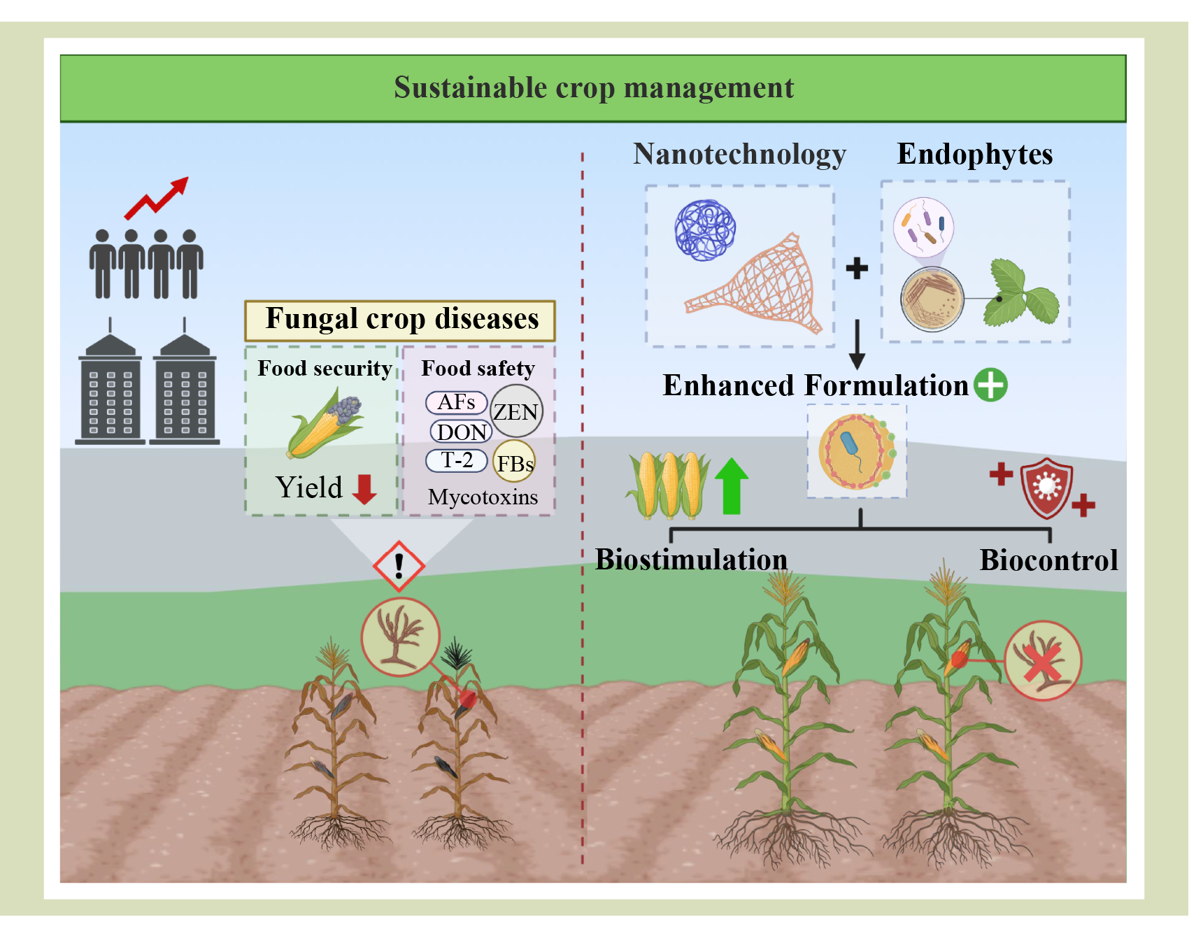 Agricultural intensification, to meet the nutritional needs of the growing world population, has been made possible through the extensive use of agrochemicals, such as synthetic fertilizers and pesticides. However, these practices pose significant health and environmental risks, including groundwater contamination, soil degradation and microbial resistance. Also, predictions indicate that relying solely on synthetic chemicals to boost production may not be enough to meet the future global need for food. Sustainable agricultural intensification involves the use of novel tools to enhance production while addressing environmental concerns using eco-friendly strategies, such as microbial inoculants. These can improve soil fertility, nutrient cycling and crop yield, while enhancing stress tolerance and overall crop fitness. This review outlines the key aspects of the global presence of plant diseases, plant defense responses and disease management strategies, and examines bacterial endophytes as crop biostimulants and biocontrol agents for sustainable control of mycotoxigenic fungi. It also proposes strategies to increase microbial product adoption by addressing technical limitations, such as field stability, delivery precision and shelf-life.