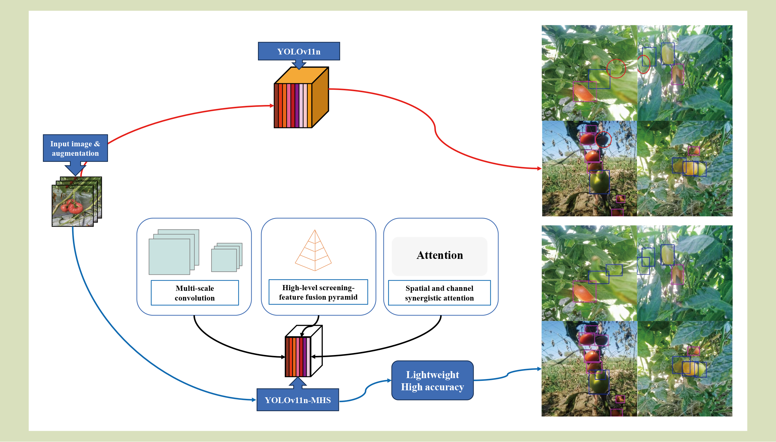 To address the challenges faced in real-world tomato ripeness detection, such as variable lighting conditions, complex backgrounds, and the trade-off between accuracy and the model being effectively lightweight, this study proposes a lightweight YOLOv11-MHS model. The improvements of the proposed model are reflected in three aspects: (1) the C3k2_MSCB module is designed, which integrates a multiscale convolutional block (MSCB) for multiscale feature extraction and fusion, thereby enhancing detection accuracy; (2) the neck of the model is redesigned as a high-level feature screening-fusion pyramid structure, which fuses key features to improve robustness in cluttered environments while reducing model size; and (3) the C2PSA module is enhanced by introducing the spatial and channel synergistic attention mechanism to improve the ability of the model to handle complex scenes. Experimental results on the same data set show that, compared to the baseline model YOLOv11n, YOLOv11-MHS achieves improvements of 1.7% in mAP0.5 and 2.9% in mAP0.5-0.95, while reducing parameters and model size by 35.2% and 32.7%, respectively. These results demonstrate that YOLOv11-MHS achieves both outstanding accuracy and lightweight performance in tomato ripeness detection, providing technical support for agricultural applications.