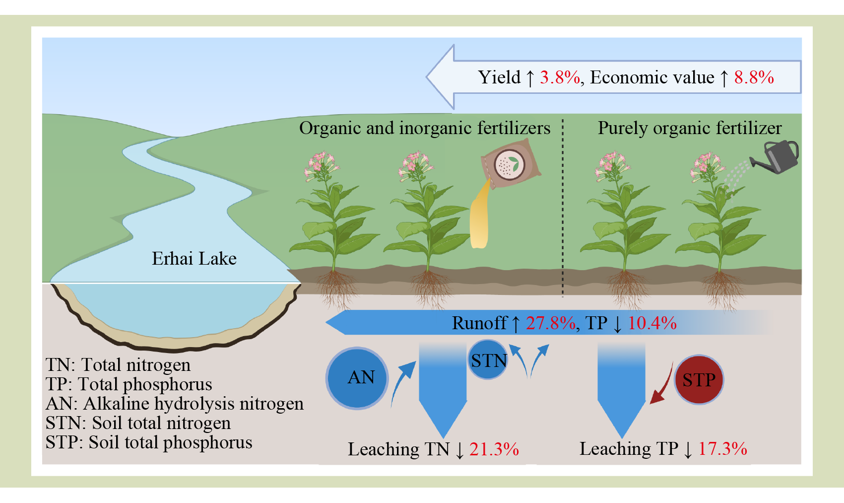 Efficient nutrient management is essential for mitigating nutrient losses from farmland in the Erhai Lake Basin (ELB). This 2-year field study (2021–2022) in the northern ELB investigated the effects of different fertilizer application methods on nitrogen and phosphorus losses. The four fertilizer treatments included: no fertilizer, farmer practice of solely organic fertilizer application (FP), mineral fertilizer, and a combination of organic and mineral fertilizers (OMC). Over the study period, total N (TN) losses ranged from 17 to 34 kg·ha−1 and total P (TP) losses from 1.0 to 1.4 kg·ha−1. Peak N and P losses occurred during June and July, with N lost primarily as nitrate and P lost primarily in dissolved forms. Compared with the FP treatment, the OMC treatment significantly reduced nutrient losses throughout the tobacco season; TN runoff decreased by 2.7 kg·ha−1, TP runoff by 0.1 kg·ha−1, TN leaching by 21% and TP leaching by 17%. Also, the OMC treatment increased the average tobacco yield by 3.8% (to 2.55 t·ha−1) compared to the FP treatment, which in turn enhanced the gross value. Fertilizer treatments significantly affected soil properties. These altered soil properties, particularly alkaline hydrolysis N and soil organic matter levels, subsequently regulated N and P loss dynamics. These results provide a scientific basis for mitigating nutrient loss from farmland in the ELB through optimized fertilizer application.