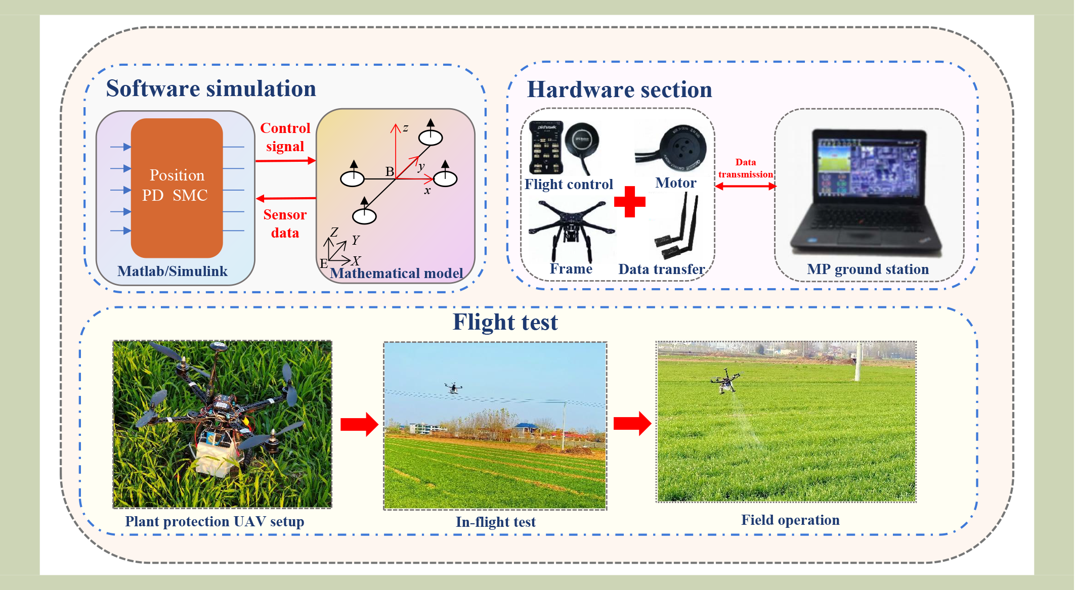 The dynamic variation issues of variable-load unmanned aerial vehicle (UAV) used in agricultural plant protection activities was addressed by a disturbance-resistant control system based on PD (proportional-derivative) sliding mode control. First, a time-varying dynamic model was developed by analyzing the variations in mass, center of gravity and moment of inertia across time. Then a trajectory tracking control approach based on PD sliding mode control was designed to develop an inner-loop attitude controller and an outer-loop trajectory controller to accomplish precise and closely coupled trajectory tracking. Numerical simulations were conducted to verify the trajectory tracking performance, demonstrating accurate tracking of the desired trajectory with standard deviations of 0.0507, 0.1613 and 0.0002 m in the horizontal, lateral and vertical directions, respectively. In terms of attitude control, the system exhibited favorable performance on the roll, pitch and yaw axes, with small transient errors and rapid convergence. Flight experiments further demonstrated that the UAV accurately followed the specified path, and errors in both straight and twisting segments satisfied control criteria. This control system ensured efficient and steady trajectory tracking, offering theoretical and application references for intelligent and precise agricultural plant protection activities.
