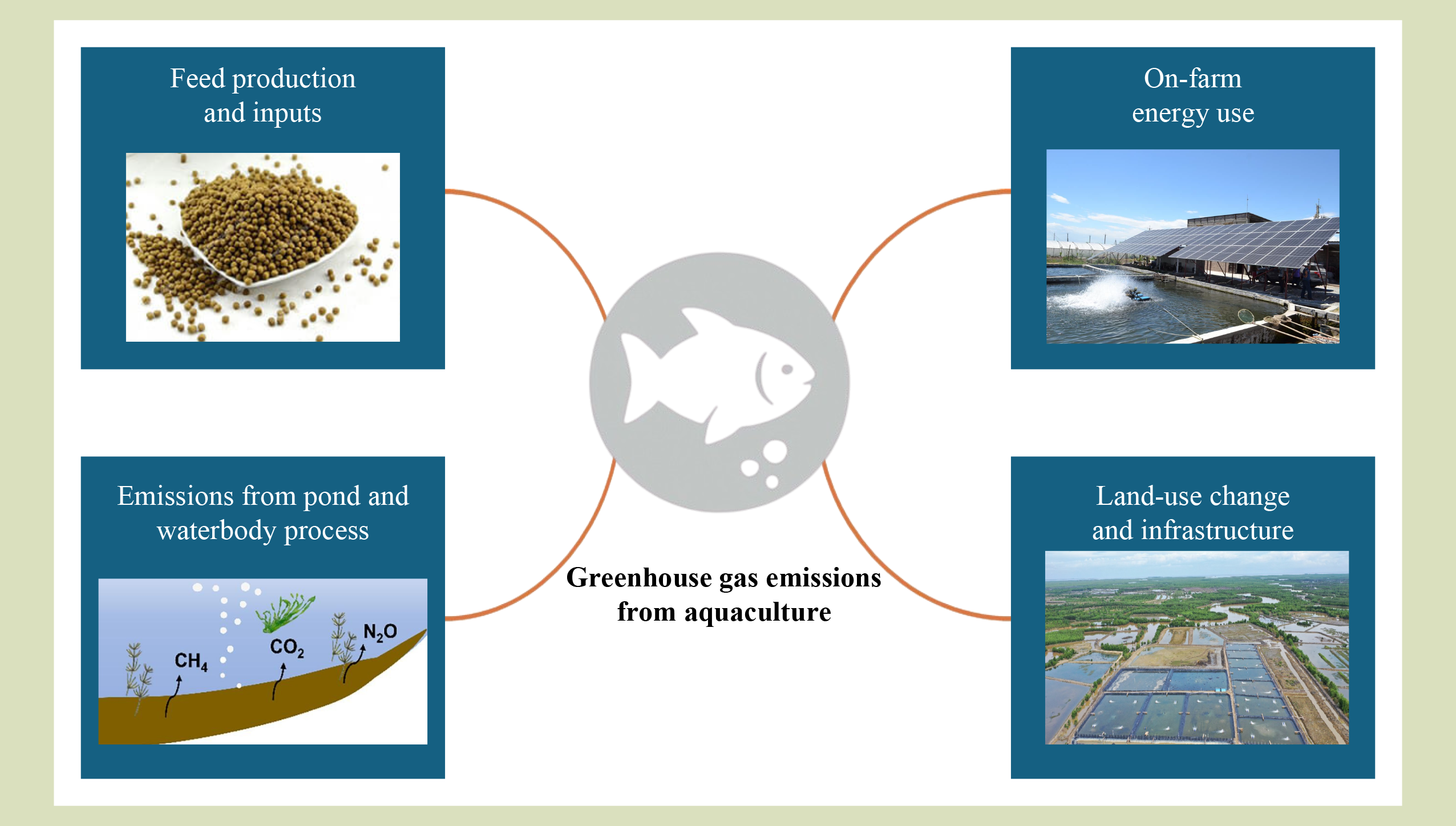 Aquaculture is increasingly important in global food production; however, its environmental impacts, particularly greenhouse gas (GHG) emissions, are subject to increasing scrutiny. This literature review synthesizes current research on GHG emissions from aquaculture, identifying key emission sources, species-specific emission patterns, geographical research trends and mitigation approaches. A systematic search was performed using the Web of Science, using search terms associated with aquaculture and GHGs. The search yielded 1821 publications. Subsequent analysis indicated a marked rise in academic interest since 2000, reaching a peak of 222 publications in 2023. Geographically, China has dominated publication output, followed by the USA, Australia and Norway. Major themes have included quantifying emissions of CO2, CH4 and N2O across species, such as mussels, salmon, shrimp, and tilapia. Seaweed and bivalves have often been identified as low-emission or carbon-sequestering organisms, whereas intensive production of shrimp and catfish tended to be associated with elevated emission levels. Notable mitigation measures included optimized feed composition, integrated multi-trophic aquaculture and adoption of renewable energy technologies. This review also highlights the lack of research in regions such as Africa and stresses the importance of adopting standardized methodologies for emission measurement and life cycle assessment. This work offers research-informed and policy-relevant guidance to advance low-carbon aquaculture systems in line with global climate objectives.
