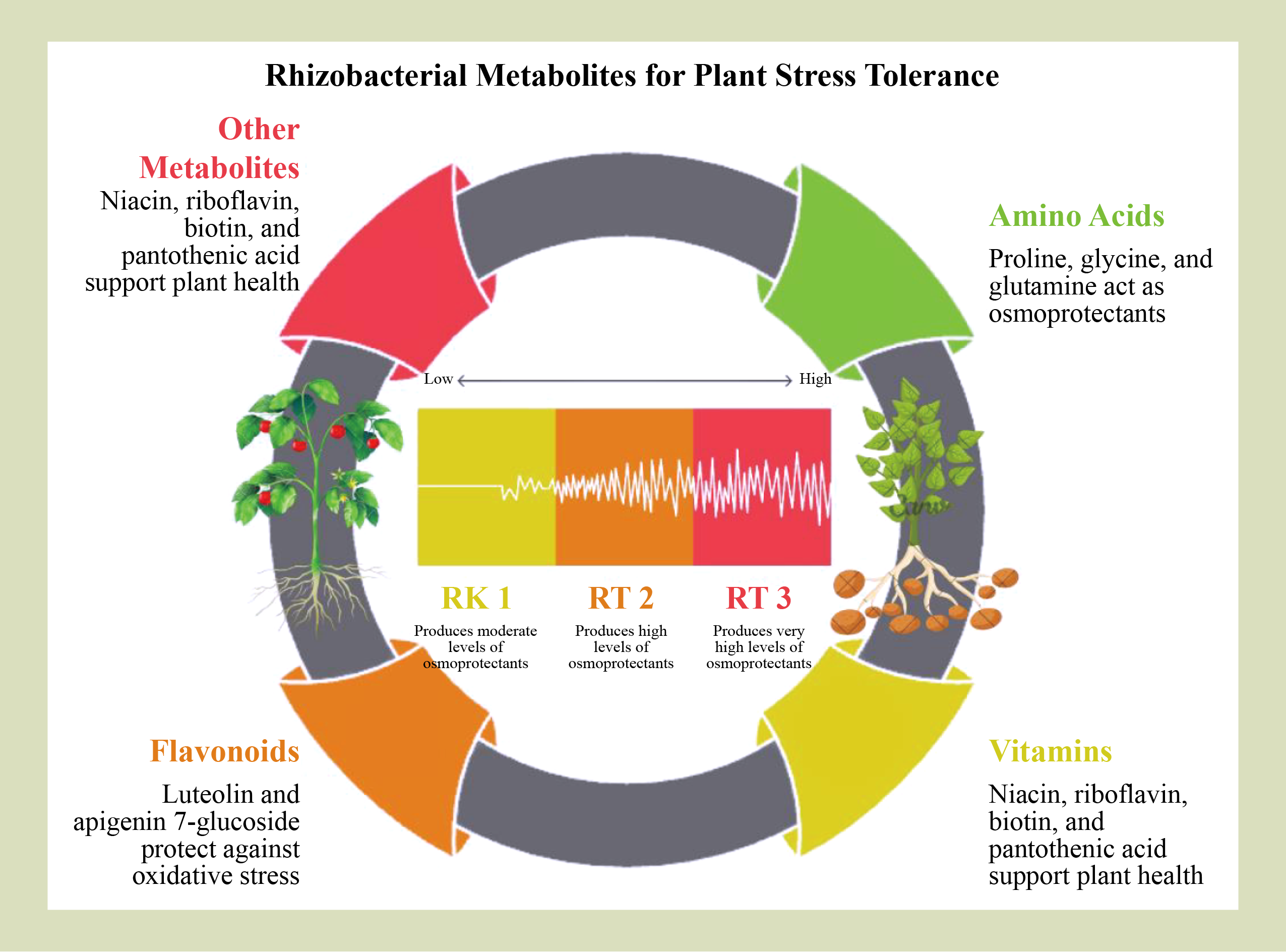 Plant growth-promoting rhizobacteria enhance plant growth and stress resilience, but the metabolite-based mechanisms behind these effects remain insufficiently characterized. This study aimed to assess the metabolite profiles of three rhizobacterial treatments (RK1, RT2 and RT3) and evaluate their effects on drought tolerance in lettuce (Lactuca sativa). The strains were cultured under standard laboratory conditions, and their intracellular metabolites were analyzed using gas chromatography-mass spectrometry. Results showed production of key compounds such as proline, glycine, glutamine, niacin, riboflavin, biotin, pantothenic acid, luteolin and apigenin 7-glucoside, with proline being the most abundant across strains. Lettuce plants were grown under controlled conditions and inoculated by soil drenching at transplantation. Drought stress was imposed 5 days after inoculation by withholding water for 7 days. Survival rate and fresh weight were measured after rewatering. Plants treated with rhizobacterial strains, particularly RT3, had significantly higher survival rates and fresh weight compared to the uninoculated control. These findings highlight the distinct contribution of specific rhizobacterial metabolites to drought tolerance and demonstrate their potential as microbial bioinoculants for improving plant performance under water-limited conditions.