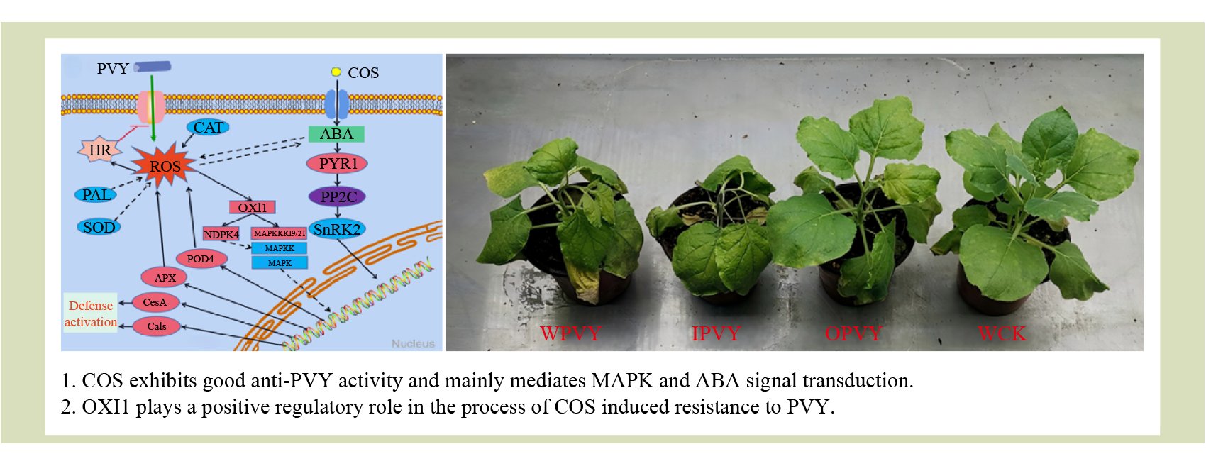 This study investigated the antiviral activity and molecular mechanisms of oligochitosan against potato virus Y (PVY) in Nicotiana benthamiana. The results demonstrate that oligochitosan exhibits significant anti-PVY activity, achieving a preventive efficacy of 54.7%. Biochemical analyses revealed that oligochitosan treatment enhances the activities of defense-related enzymes and stimulates hydrogen peroxide accumulation in N. benthamiana. Integrated transcriptomic and proteomic analyses identified key differentially expressed genes associated with reactive oxygen species signaling and the mitogen-activated protein kinase pathway, including PYL1, PP2C, OXI1, NDPK4, MAPKKK21 and POD4. Functional characterization demonstrated that oligochitosan specifically upregulates OXI1 expression while enhancing MAPKKK21 and NDPK4 transcript levels, thereby conferring enhanced PVY resistance. These findings establish that oligochitosan-induced plant defense against PVY operates primarily through ROS-mediated activation of the mitogen-activated protein kinase signaling cascade. This work provides novel insights into the molecular basis of the antiviral activity of oligochitosan in plant protection.
