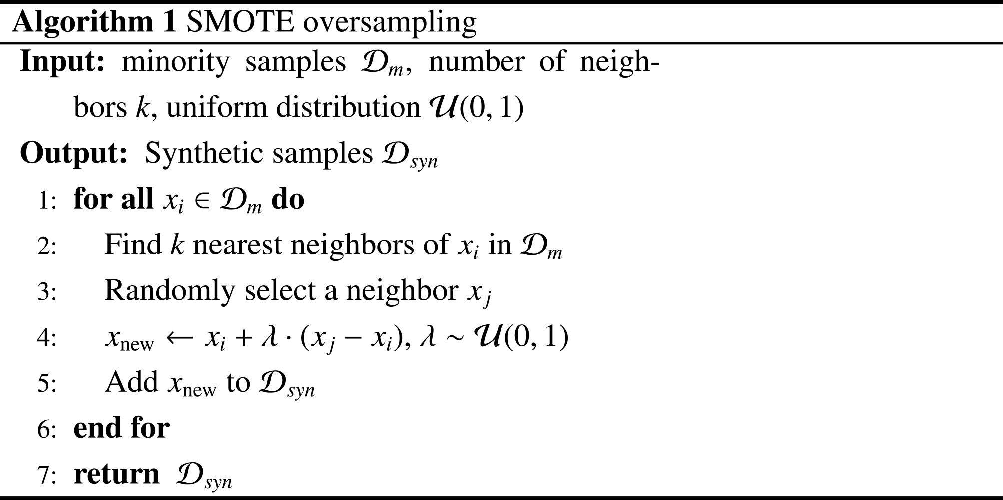 SMOTE selects k pairs of nearest minority neighbors and performs linear interpolation to create new synthetic minority samples. The pseudo-code is shown as Algorithm 1. This method effectively mitigates overfitting and enhances classifier learning. Nonetheless, SMOTE generates an equal number of synthetic samples for each original minority sample, disregarding neighboring sample distribution characteristics and potentially causing over-representation of certain classes. To address this, recent advancements include D-SMOTE [7], which generates synthetic samples using mean points of nearest neighbors, and N-SMOTE [8], which employs structural information in neighbor calculations. Adaptive techniques like Borderline-SMOTE only generate synthetic samples for boundary minority samples [9], and ADASYN [10] adjusts sample generation based on density distribution. Moreover, MSMOTE categorizes minority samples into safe, border, and latent noise groups and selectively generates samples for border instances [11]. With over 100 variants developed to date, SMOTE stands out as one of the most influential and effective methods in the realm of data generation for addressing class imbalance. Given the focus of our paper on a comprehensive survey for imbalanced data, we recommend readers who are particularly interested in SMOTE and its extensive family of variants to refer to a SMOTE survey [12].