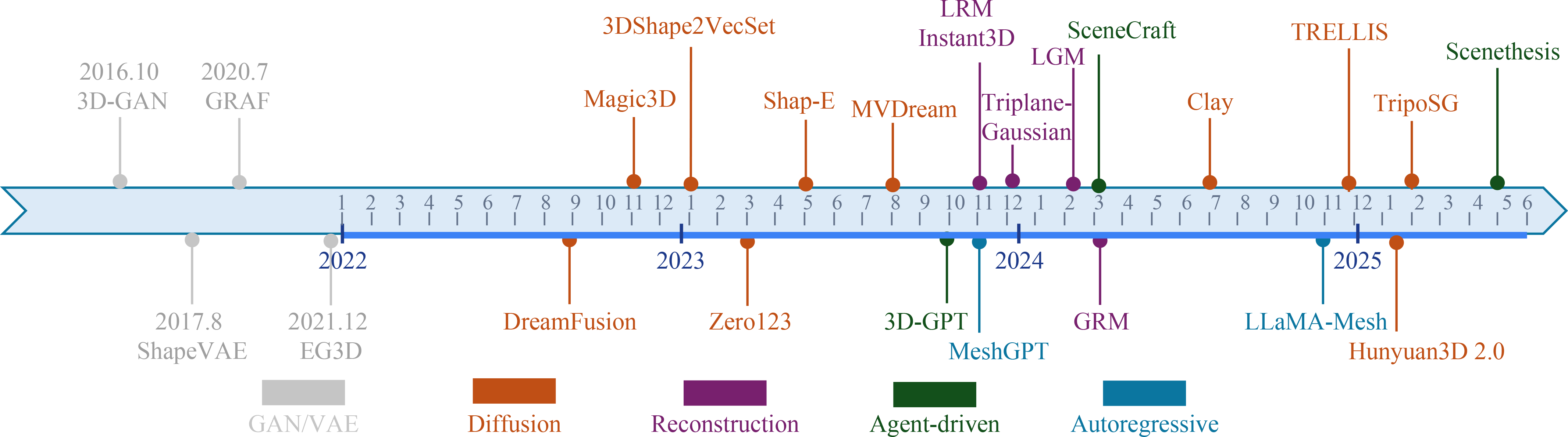 3D generation paradigms / autoregressive models / agent-driven 3D generation