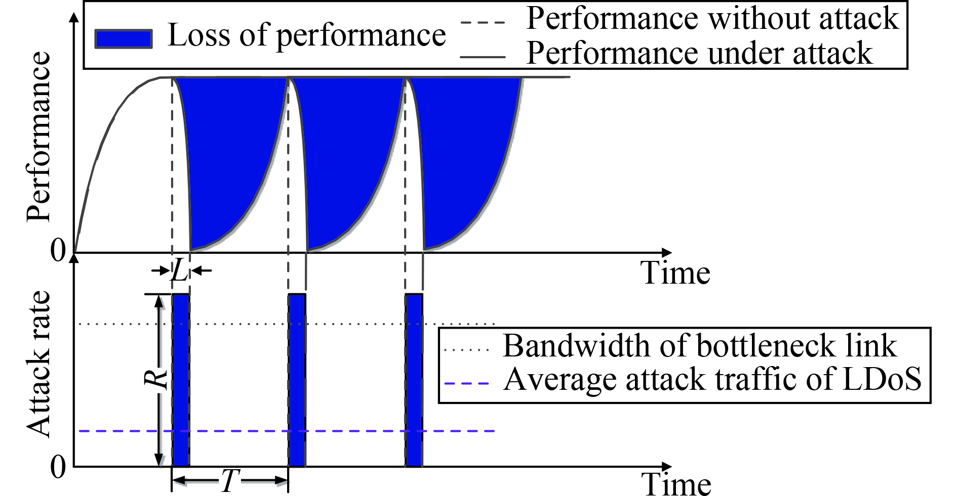 Cybersecurity has always been the focus of Internet research. An LDoS attack is an intelligent type of DoS attack, which reduces the quality of network service by periodically sending high-speed but short-pulse attack traffic. Because of its concealment and low average rate, the traditional DoS attack detection methods are challenging to be effective. The existing LDoS attack detection methods generally have the problems of high FPR and FNR. A cloud model-based LDoS attack detection method is proposed, and a classifier based on SVM is used to train and classify the feature parameters. The detection method is verified and tested in the NS2 simulation platform and Test-bed network environment. Compared with the existing research results, the proposed method requires fewer samples, and it has lower FPR and FNR.