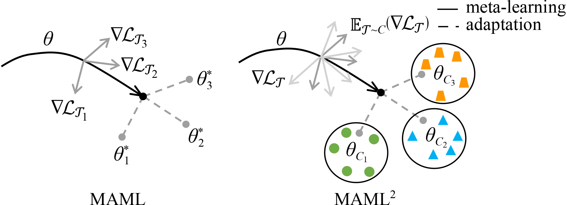 Meta-learning has been widely applied to solving few-shot reinforcement learning problems, where we hope to obtain an agent that can learn quickly in a new task. However, these algorithms often ignore some isolated tasks in pursuit of the average performance, which may result in negative adaptation in these isolated tasks, and they usually need sufficient learning in a stationary task distribution. In this paper, our algorithm presents a hierarchical framework of double meta-learning, and the whole framework includes classification, meta-learning, and re-adaptation. Firstly, in the classification process, we classify tasks into several task subsets, considered as some categories of tasks, by learned parameters of each task, which can separate out some isolated tasks thereafter. Secondly, in the meta-learning process, we learn category parameters in all subsets via meta-learning. Simultaneously, based on the gradient of each category parameter in each subset, we use meta-learning again to learn a new meta-parameter related to the whole task set, which can be used as an initial parameter for the new task. Finally, in the re-adaption process, we adapt the parameter of the new task with two steps, by the meta-parameter and the appropriate category parameter successively. Experimentally, we demonstrate our algorithm prevents the agent from negative adaptation without losing the average performance for the whole task set. Additionally, our algorithm presents a more rapid adaptation process within re-adaptation. Moreover, we show the good performance of our algorithm with fewer samples as the agent is exposed to an online meta-learning setting.