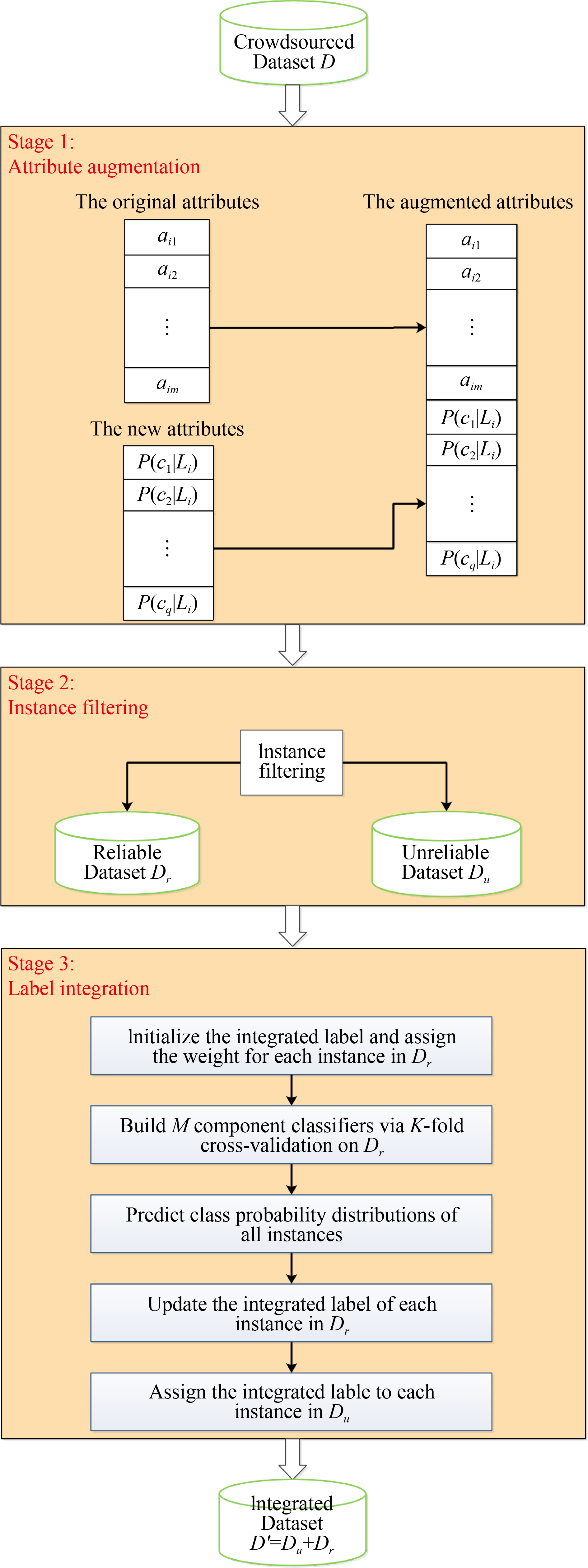 Crowdsourcing provides an effective and low-cost way to collect labels from crowd workers. Due to the lack of professional knowledge, the quality of crowdsourced labels is relatively low. A common approach to addressing this issue is to collect multiple labels for each instance from different crowd workers and then a label integration method is used to infer its true label. However, to our knowledge, almost all existing label integration methods merely make use of the original attribute information and do not pay attention to the quality of the multiple noisy label set of each instance. To solve these issues, this paper proposes a novel three-stage label integration method called attribute augmentation-based label integration (AALI). In the first stage, we design an attribute augmentation method to enrich the original attribute space. In the second stage, we develop a filter to single out reliable instances with high-quality multiple noisy label sets. In the third stage, we use majority voting to initialize integrated labels of reliable instances and then use cross-validation to build multiple component classifiers on reliable instances to predict all instances. Experimental results on simulated and real-world crowdsourced datasets demonstrate that AALI outperforms all the other state-of-the-art competitors.