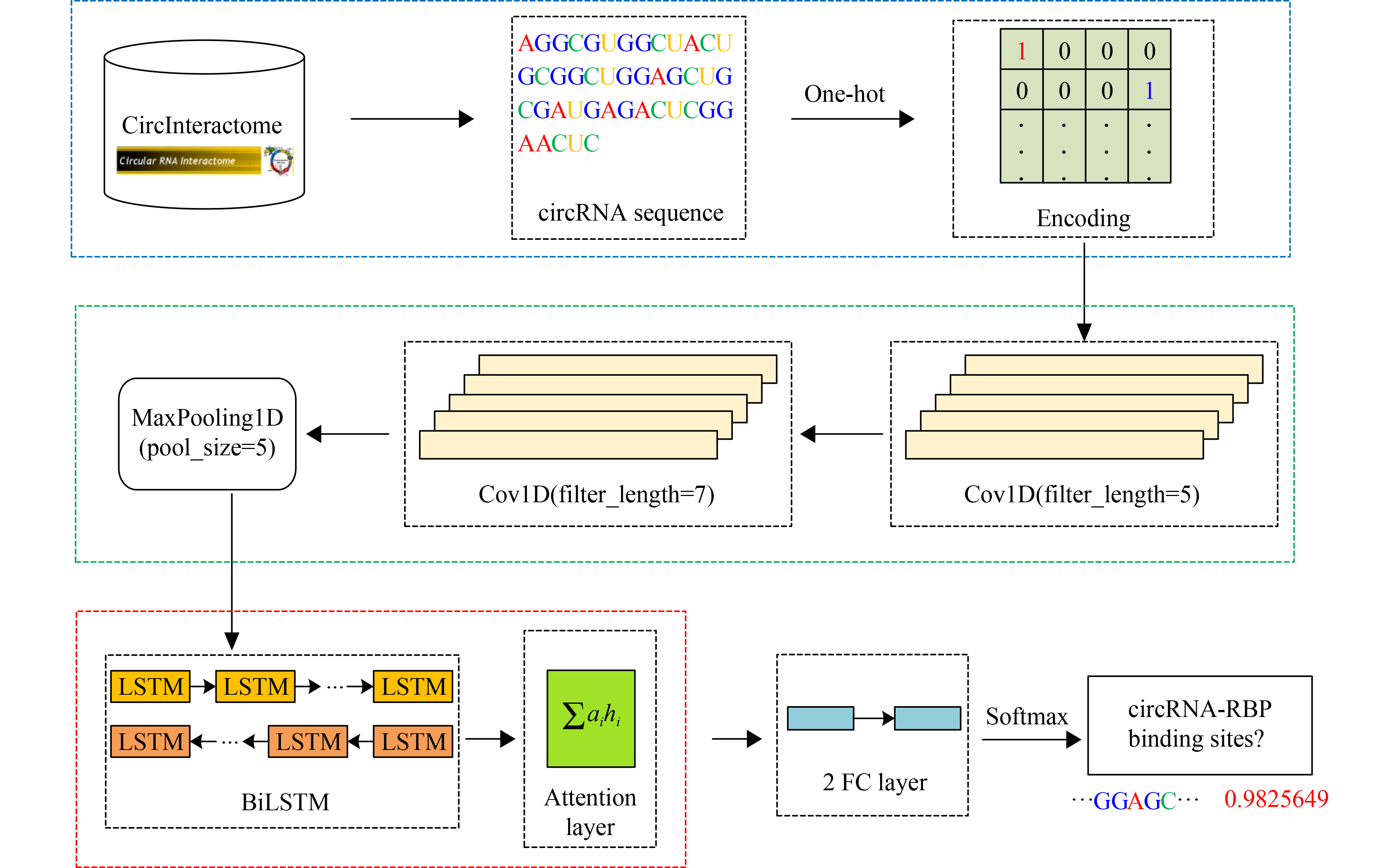 Circular RNAs (circRNAs) are RNAs with closed circular structure involved in many biological processes by key interactions with RNA binding proteins (RBPs). Existing methods for predicting these interactions have limitations in feature learning. In view of this, we propose a method named circ2CBA, which uses only sequence information of circRNAs to predict circRNA-RBP binding sites. We have constructed a data set which includes eight sub-datasets. First, circ2CBA encodes circRNA sequences using the one-hot method. Next, a two-layer convolutional neural network (CNN) is used to initially extract the features. After CNN, circ2CBA uses a layer of bidirectional long and short-term memory network (BiLSTM) and the self-attention mechanism to learn the features. The AUC value of circ2CBA reaches 0.8987. Comparison of circ2CBA with other three methods on our data set and an ablation experiment confirm that circ2CBA is an effective method to predict the binding sites between circRNAs and RBPs.