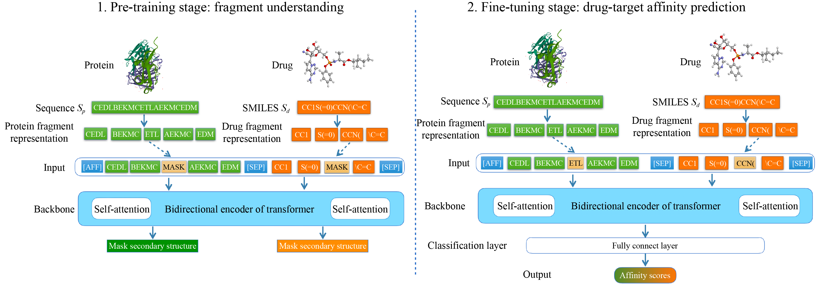 In this paper, we propose a novel model, named FragDPI, to predict the drug-protein binding affinity. Unlike other methods, we encode the sequences based on the conserved fragments and encode the protein and drug into a unified vector. Moreover, we adopt a novel two-step training strategy to train FragDPI. The pre-training step is to learn the interactions between different fragments using unsupervised learning. The fine-tuning step is for predicting the binding affinities using supervised learning. The experiment results have illustrated the superiority of FragDPI.