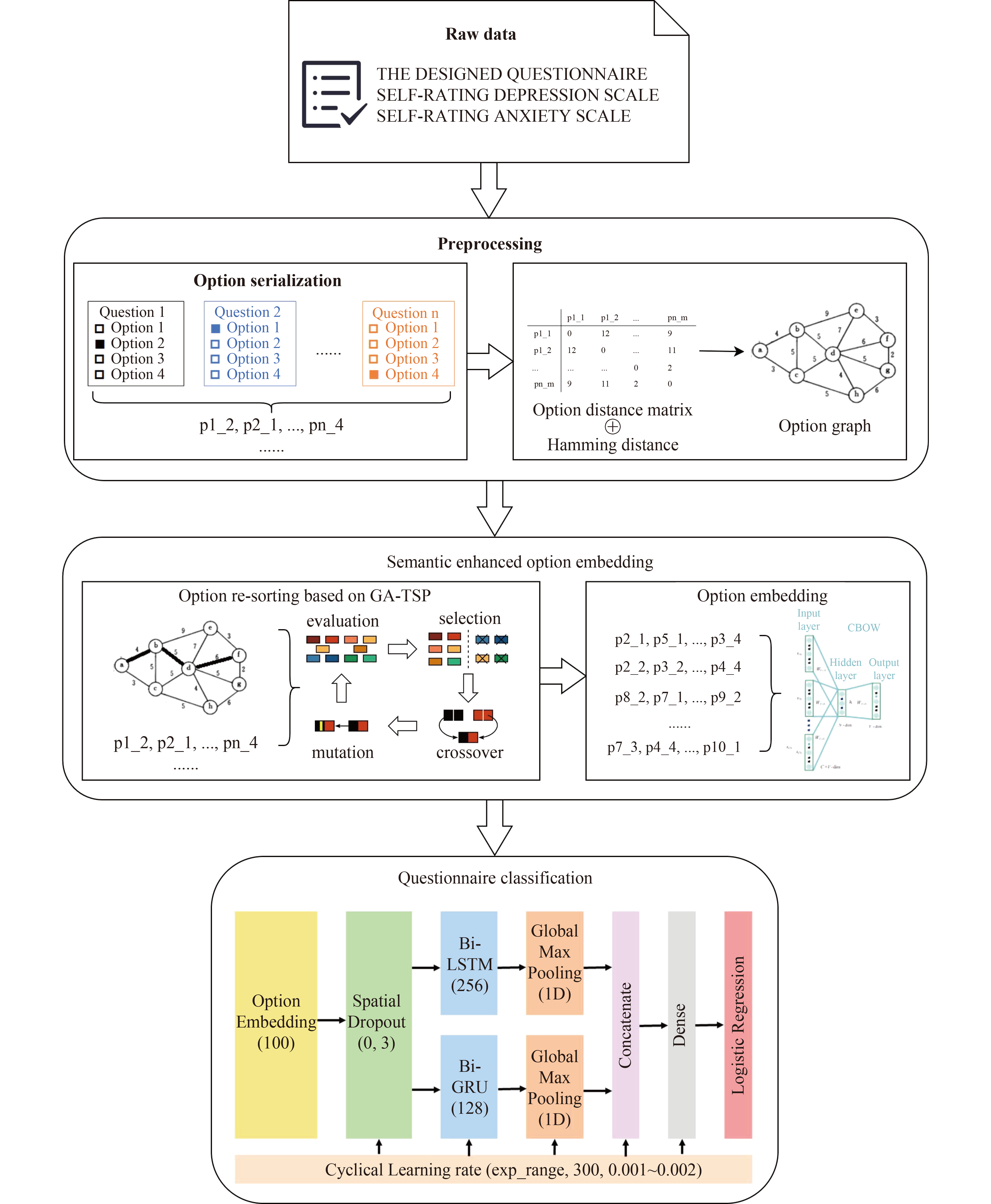 Prenatal depression, which can affect pregnant women’s physical and psychological health and cause postpartum depression, is increasing dramatically. Therefore, it is essential to detect prenatal depression early and conduct an attribution analysis. Many studies have used questionnaires to screen for prenatal depression, but the existing methods lack attributability. To diagnose the early signs of prenatal depression and identify the key factors that may lead to prenatal depression from questionnaires, we present the semantically enhanced option embedding (SEOE) model to represent questionnaire options. It can quantitatively determine the relationship and patterns between options and depression. SEOE first quantifies options and resorts them, gathering options with little difference, since Word2Vec is highly dependent on context. The resort task is transformed into an optimization problem involving the traveling salesman problem. Moreover, all questionnaire samples are used to train the options’ vector using Word2Vec. Finally, an LSTM and GRU fused model incorporating the cycle learning rate is constructed to detect whether a pregnant woman is suffering from depression. To verify the model, we compare it with other deep learning and traditional machine learning methods. The experiment results show that our proposed model can accurately identify pregnant women with depression and reach an F1 score of 0.8. The most relevant factors of depression found by SEOE are also verified in the literature. In addition, our model is of low computational complexity and strong generalization, which can be widely applied to other questionnaire analyses of psychiatric disorders.