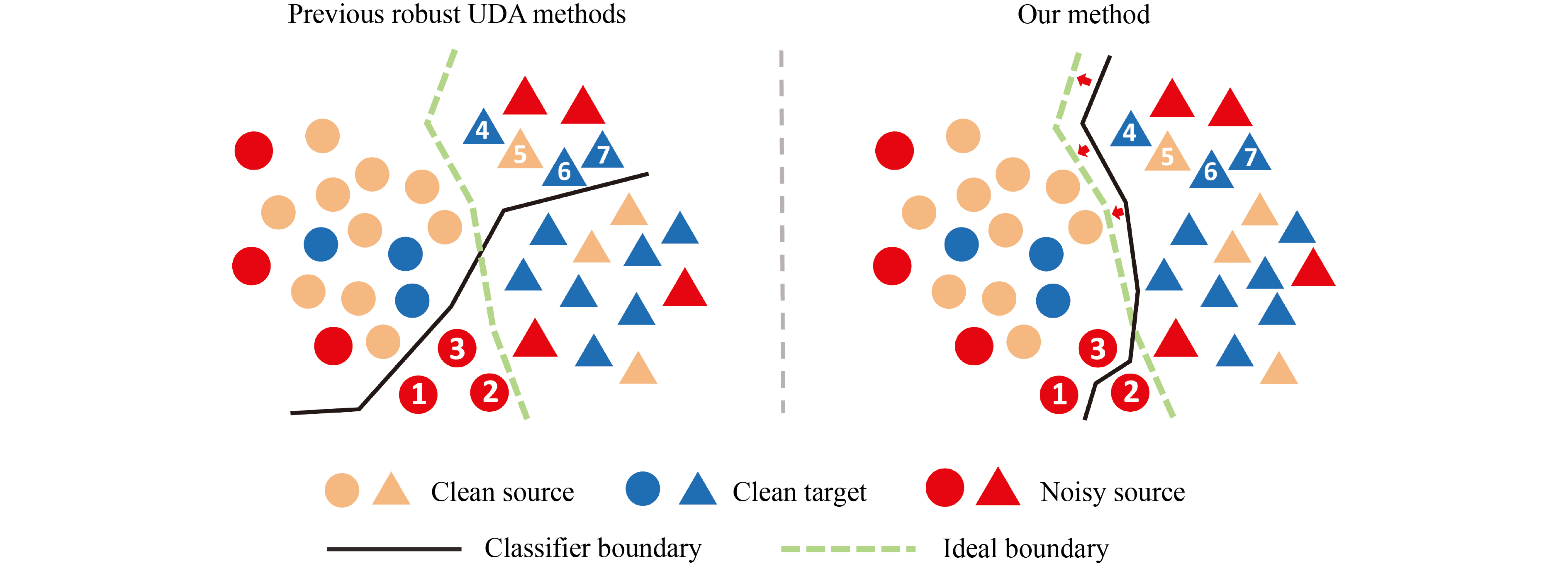 Unsupervised Domain Adaptation (UDA) intends to achieve excellent results by transferring knowledge from labeled source domains to unlabeled target domains in which the data or label distribution changes. Previous UDA methods have acquired great success when labels in the source domain are pure. However, even the acquisition of scare clean labels in the source domain needs plenty of costs as well. In the presence of label noise in the source domain, the traditional UDA methods will be seriously degraded as they do not deal with the label noise. In this paper, we propose an approach named Robust Self-training with Label Refinement (RSLR) to address the above issue. RSLR adopts the self-training framework by maintaining a Labeling Network (LNet) on the source domain, which is used to provide confident pseudo-labels to target samples, and a Target-specific Network (TNet) trained by using the pseudo-labeled samples. To combat the effect of label noise, LNet progressively distinguishes and refines the mislabeled source samples. In combination with class re-balancing to combat the label distribution shift issue, RSLR achieves effective performance on extensive benchmark datasets.