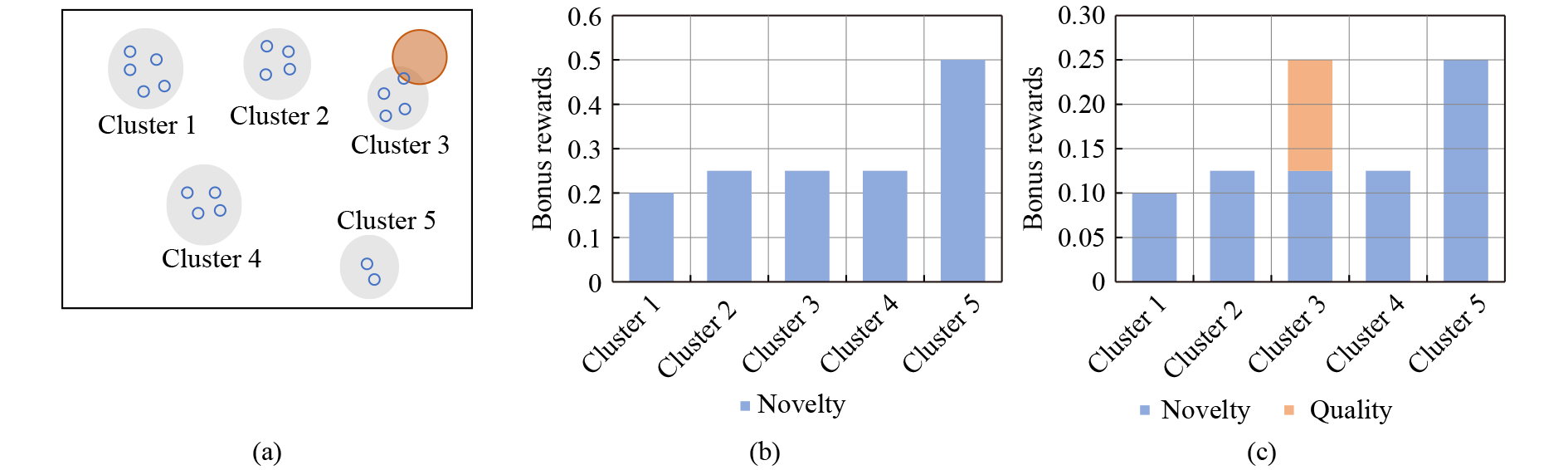Exploration strategy design is a challenging problem in reinforcement learning (RL), especially when the environment contains a large state space or sparse rewards. During exploration, the agent tries to discover unexplored (novel) areas or high reward (quality) areas. Most existing methods perform exploration by only utilizing the novelty of states. The novelty and quality in the neighboring area of the current state have not been well utilized to simultaneously guide the agent’s exploration. To address this problem, this paper proposes a novel RL framework, called clustered reinforcement learning (CRL), for efficient exploration in RL. CRL adopts clustering to divide the collected states into several clusters, based on which a bonus reward reflecting both novelty and quality in the neighboring area (cluster) of the current state is given to the agent. CRL leverages these bonus rewards to guide the agent to perform efficient exploration. Moreover, CRL can be combined with existing exploration strategies to improve their performance, as the bonus rewards employed by these existing exploration strategies solely capture the novelty of states. Experiments on four continuous control tasks and six hard-exploration Atari-2600 games show that our method can outperform other state-of-the-art methods to achieve the best performance.