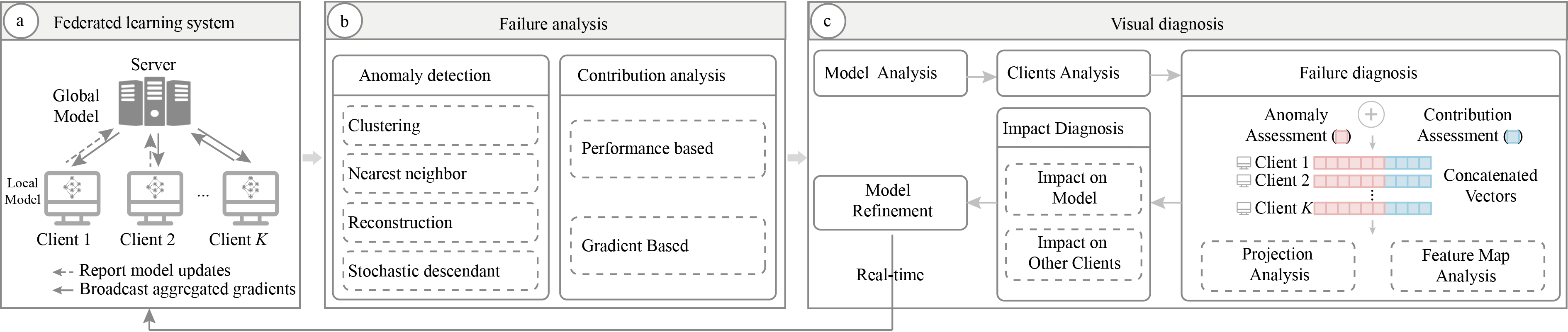 Federated Learning (FL) is a machine learning paradigm where multiple data owners collaboratively train a model under the coordination of a central server, while keeping all data decentralized. Such a paradigm allows models to be trained effectively while avoiding data privacy leakage. However, federated learning is vulnerable to various kinds of failures as a result of both intentional (malicious) and none intentional (non-malicious) attacks. Existing studies on attacks in federated learning are mostly dedicated to the automatic defense against malicious attacks (e.g., data poisoning attacks). Relatively, less attention has been given to handling non-malicious failures (e.g., non-independent and identically distributed data failures), which are actually more common and difficult-to-handle in a federated learning setting. In this paper, we propose FedCare, a real-time visual diagnosis approach for handling failures in federated learning systems. The functionality of FedCare includes the identification of failures, the assessment of their nature (malicious or non-malicious), the study of their impact, and the recommendation of adequate defense strategies. Our design is multi-faceted, giving perspectives from the angles of model performance, anomaly/contribution assessment of clients, features maps, group activities, and client impact. We demonstrate the effectiveness of our approach through two case studies, a quantitative experiment and an expert interview.