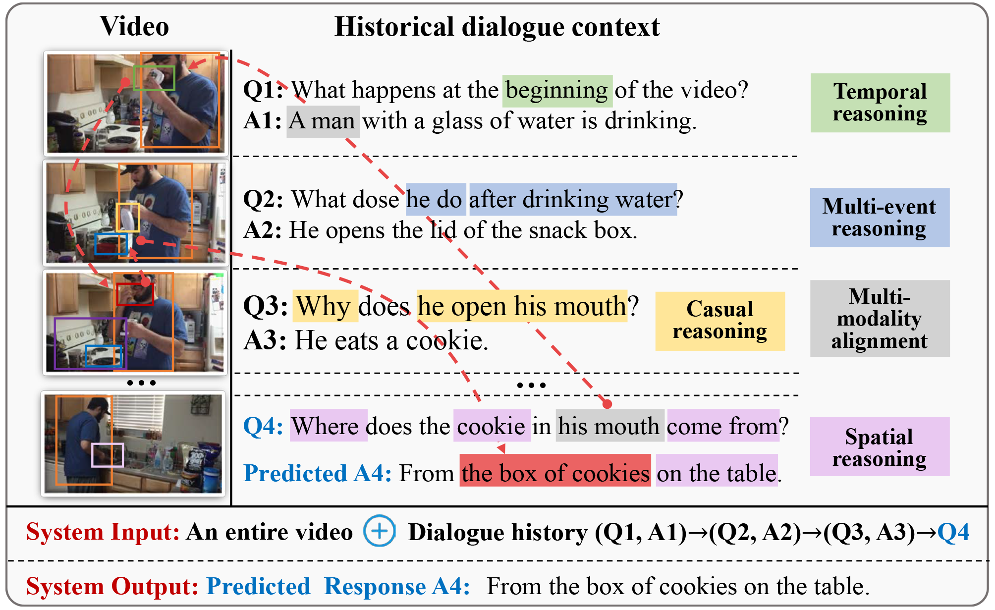 Video-Grounded Dialogue System (VGDS), focusing on generating reasonable responses based on multi-turn dialogue contexts and a given video, has received intensive attention recently. The key to building a superior VGDS lies in efficiently reasoning over visual and textual concepts of various granularities and achieving comprehensive visual-textual multi-modality alignment. Despite remarkable research progress, existing studies suffer from identifying context-relevant video parts while disregarding the impact of redundant information in long-form and content-dynamic videos. Further, current methods usually align all semantics in different modalities uniformly using a one-time cross-attention scheme, which neglects the sophisticated correspondence between various granularities of visual and textual concepts (e.g., still objects with nouns, dynamic events with verbs). To this end, we propose a novel system, namely Cascade cOntext-oriented Spatio-Temporal Attention Network (COSTA), to generate reasonable responses efficiently and accurately. Specifically, COSTA first adopts a cascade attention network to localize only the most relevant video clips and regions in a coarse-to-fine manner which effectively filters the irrelevant visual semantics. Secondly, we design a memory distillation-inspired iterative visual-textual cross-attention strategy to progressively integrate visual semantics with dialogue contexts across varying granularities, facilitating extensive multi-modal alignment. Experiments on several benchmarks demonstrate significant improvements in our model over state-of-the-art methods across various metrics.