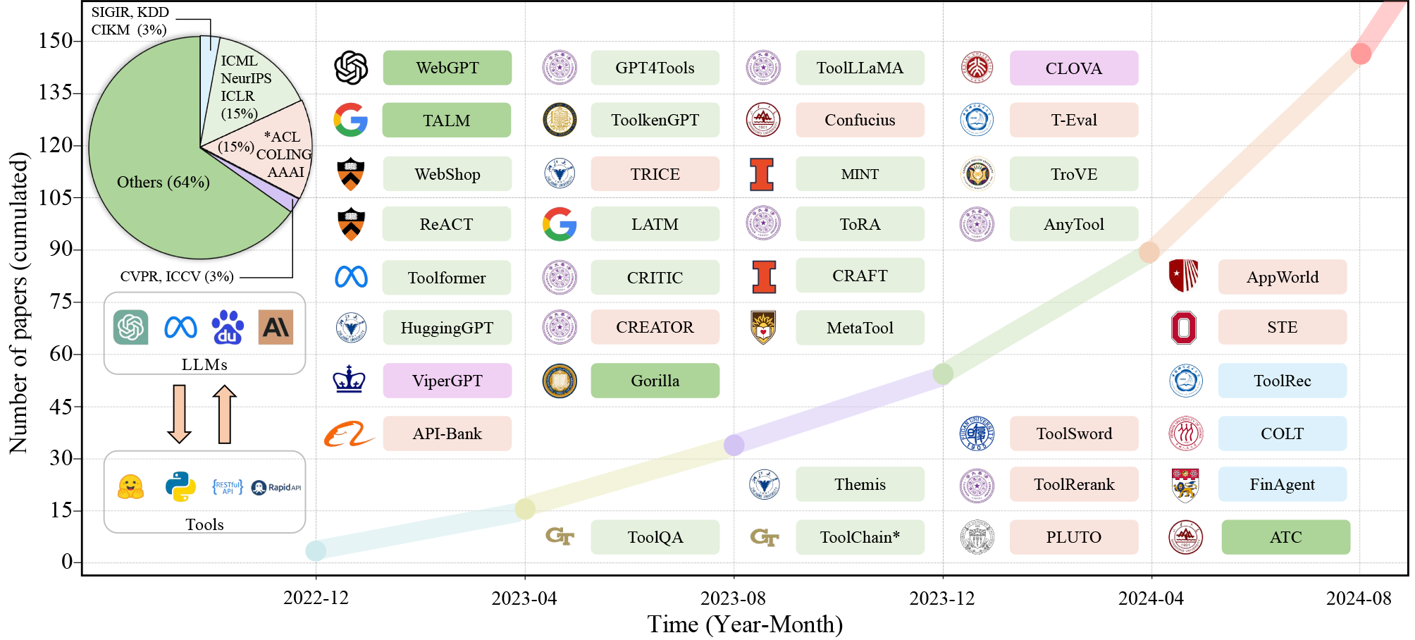 Recently, tool learning with large language models (LLMs) has emerged as a promising paradigm for augmenting the capabilities of LLMs to tackle highly complex problems. Despite growing attention and rapid advancements in this field, the existing literature remains fragmented and lacks systematic organization, posing barriers to entry for newcomers. This gap motivates us to conduct a comprehensive survey of existing works on tool learning with LLMs. In this survey, we focus on reviewing existing literature from the two primary aspects (1) why tool learning is beneficial and (2) how tool learning is implemented, enabling a comprehensive understanding of tool learning with LLMs. We first explore the “why” by reviewing both the benefits of tool integration and the inherent benefits of the tool learning paradigm from six specific aspects. In terms of “how”, we systematically review the literature according to a taxonomy of four key stages in the tool learning workflow: task planning, tool selection, tool calling, and response generation. Additionally, we provide a detailed summary of existing benchmarks and evaluation methods, categorizing them according to their relevance to different stages. Finally, we discuss current challenges and outline potential future directions, aiming to inspire both researchers and industrial developers to further explore this emerging and promising area.