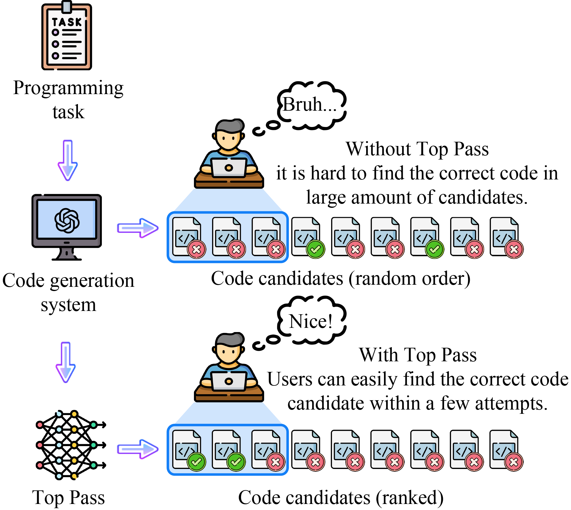 Code generation has been greatly enhanced by the profound advancements in Large Language Models (LLMs) recently. Nevertheless, such LLM-based code generation approaches still struggle to generate error-free code in a few tries when faced with complex problems. To address this, the prevailing strategy is to sample a huge number of candidate programs, with the hope of any one in them could work. However, users of code generation systems usually expect to find a correct program by reviewing or testing only a small number of code candidates. Otherwise, the system would be unhelpful. In this paper, we propose Top Pass, a code ranking approach that identifies potential correct solutions from a large number of candidates. Top Pass directly optimizes the pass@k loss function, enhancing the quality at the top of the candidate list. This enables the user to find the correct solution within as few tries as possible. Experimental results on four benchmarks indicate that our Top Pass method enhances the usability of code generation models by producing better ranking results, particularly achieving a 32.9% relative improvement in pass@1 on CodeContests when compared to the state-of-the-art ranking method.