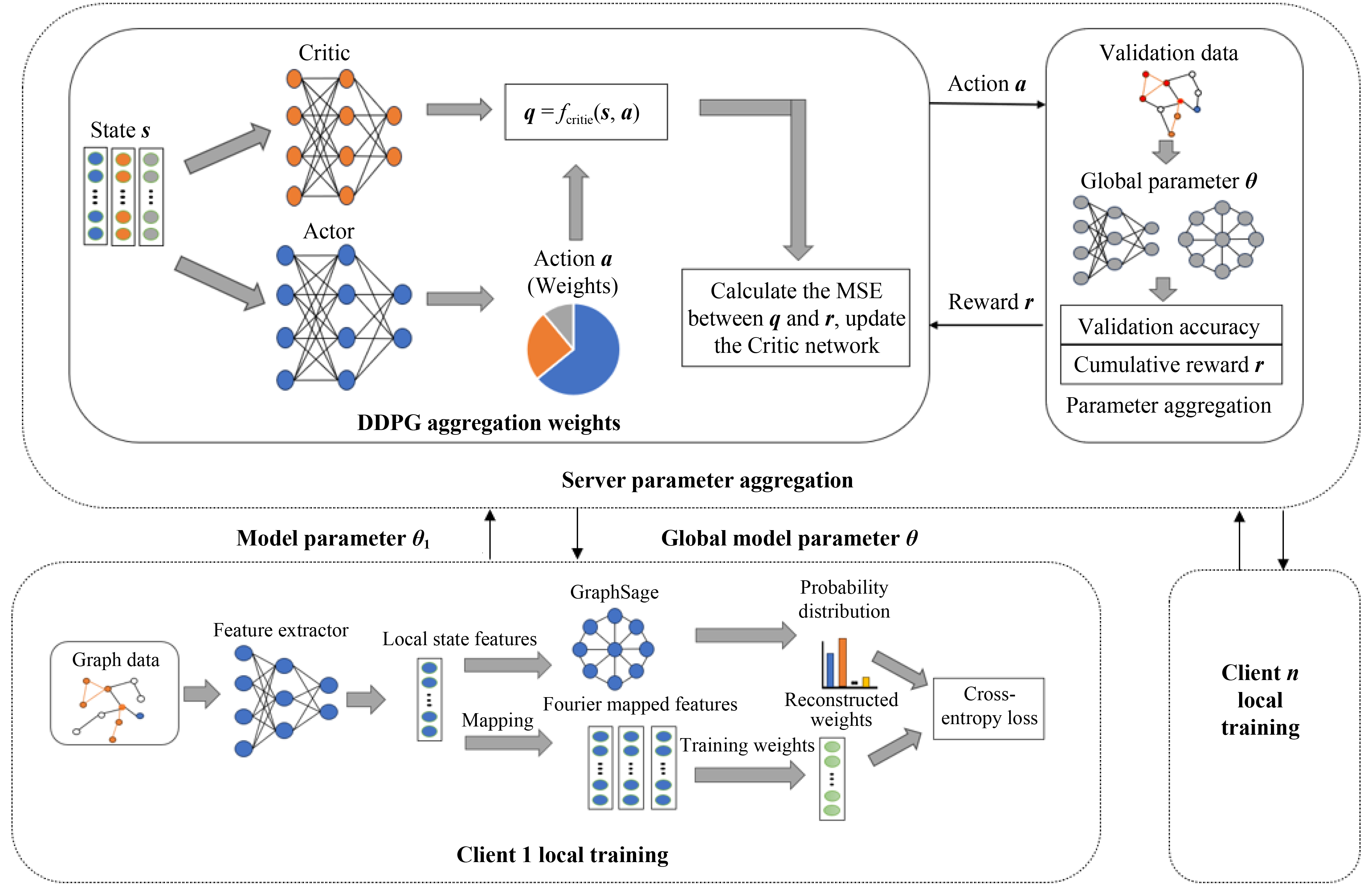 In recent years, research has increasingly transformed data into graph representations, using graph neural networks to extract rich relationships and interaction information. This enhances the model’s ability to understand and process complex data structures. Due to the privacy and sensitivity of certain data, especially in government and enterprise fields, these high-quality data are often strictly controlled, limiting centralized model training. These issues lead to weaker generalization of traditional models for unseen data. To address these challenges, this paper proposes a Reinforced Federated Graph Domain Generalization (RFGDG) method, which improves generalization across domain data scenarios while protecting data privacy through multi-party collaboration. We design a mini-batch processing strategy based on graph sampling, combined with GraphSage, to build an efficient local graph-based node classification model. This sampling strategy reduces computational overhead while preserving graph structure, improving local model performance. To address data heterogeneity and feature inconsistency across clients, we propose a federated graph domain generalization strategy based on random Fourier feature transformation and weighted covariance matrix optimization, which unifies feature representations, reduces redundancy, and enhances adaptability to inconsistent data. We also propose a dynamic parameter aggregation strategy for federated graph neural networks using deep reinforcement learning. With the Deep Deterministic Policy Gradient (DDPG) algorithm, we dynamically adjust aggregation weights based on each client’s contribution, improving global model accuracy and convergence speed. This strategy considers graph structure heterogeneity and client contribution differences, ensuring generalization in multi-client environments. Extensive experiments on three public graph datasets and one dataset from the Weibo platform demonstrate that the proposed RFGDG method significantly improves global model accuracy and shows stronger robustness and adaptability in multi-client environments.