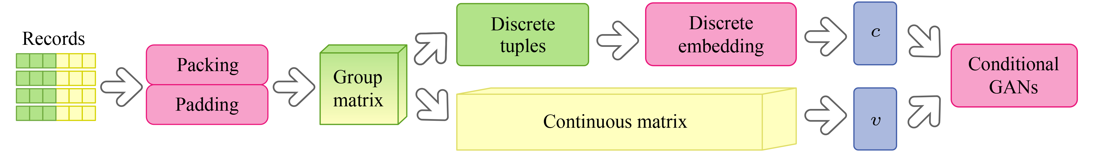 Existing table synthesis works, mostly using deep generative models (e.g., GAN or VAE), try to learn the density function (or true data distribution) of the real table from sampled real records, by treating each record separately. In practice, the assumption that records are not correlated is often violated (e.g., different purchase records for the same product should be correlated). Failing to capture such correlation across records will result in a synthesized table that does not resemble the real table. Consequently, the ML model trained using the synthetic table performs very differently from the ML model trained using the real table. In this paper, we explicitly model such record correlation as groups determined by user-specified categorical values, e.g., records with the same (Market, Product) values should be in the same group. Given such groups, we propose to use conditional GANs to simultaneously model the probability densities of discrete (e.g., categorical) values and continuous (e.g., numeric) values that may co-exist within a record, to ensure that both global data distribution (within a table) and local data distributions (within groups of a table) are preserved in the synthetic table. Moreover, we extend previous differentially private GAN (DPGAN) that only ensures the discriminator of GAN is differentially private to further ensure the privacy of the original data embeddings and sample frequencies. Experiments show that our approach significantly outperforms the SOTA table synthesis methods for supervised ML, and can well protect privacy while providing high utility.