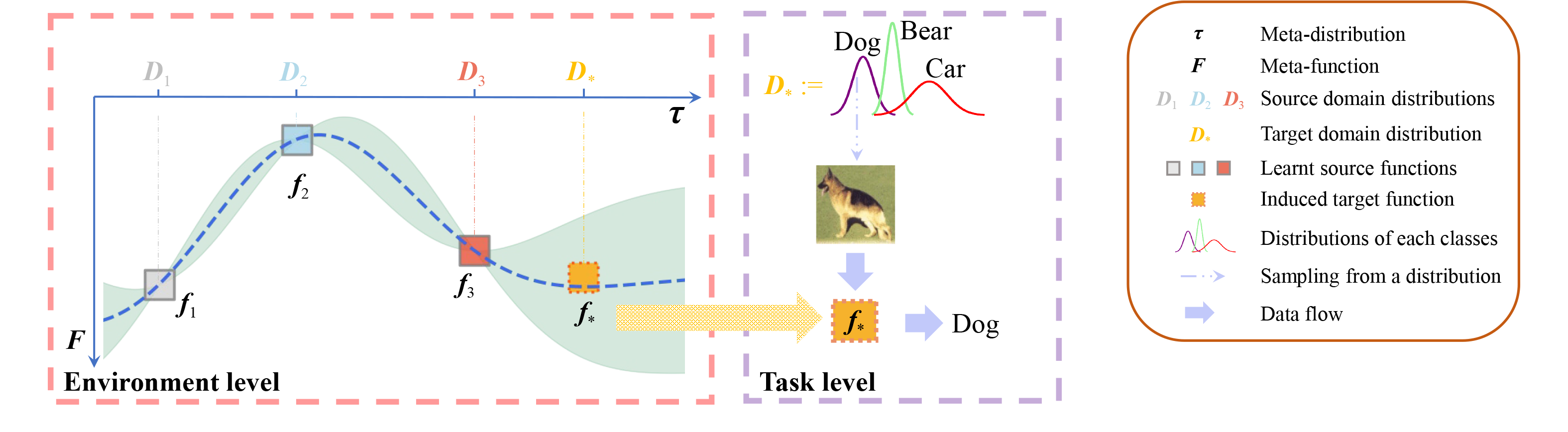 Domain Generalization (DG) aims to learn a well-generalized model for unseen target domains from multiple observed source domains. Most current approaches, e.g., domain-invariant representation, typically focus on learning a universal sample-to-label mapping (function) across domains and have achieved impressive performance. Nonetheless, they usually overlook semantically intrinsic domain-specific information, resulting in limited generalizability. For compensation, in this paper, we adopt a novel standpoint, that is, a domain can be regarded as a meta-sample sampling from a certain meta-distribution, namely an environment distribution. With this perspective, in DG, functions learned from individual domains can be seen as a collective set of functional samples. Consequently, we can establish a meta-function, mapping from the environment to functions, to induce specific functions for unseen domains from the above function set effectively. To achieve this meta-function, we propose a learning paradigm based on Gaussian process with theoretical guarantee, namely Generalization Process for Domain Generalization (GPDG). Specifically, analogous to traditional Gaussian process, we describe the inference process in DG as Gaussian process fed with samples and their corresponding domain distributions. Furthermore, we employ a domain augmentation strategy to refine its smoothness. Extensive experiments are constructed to demonstrate the effectiveness of GPDG.