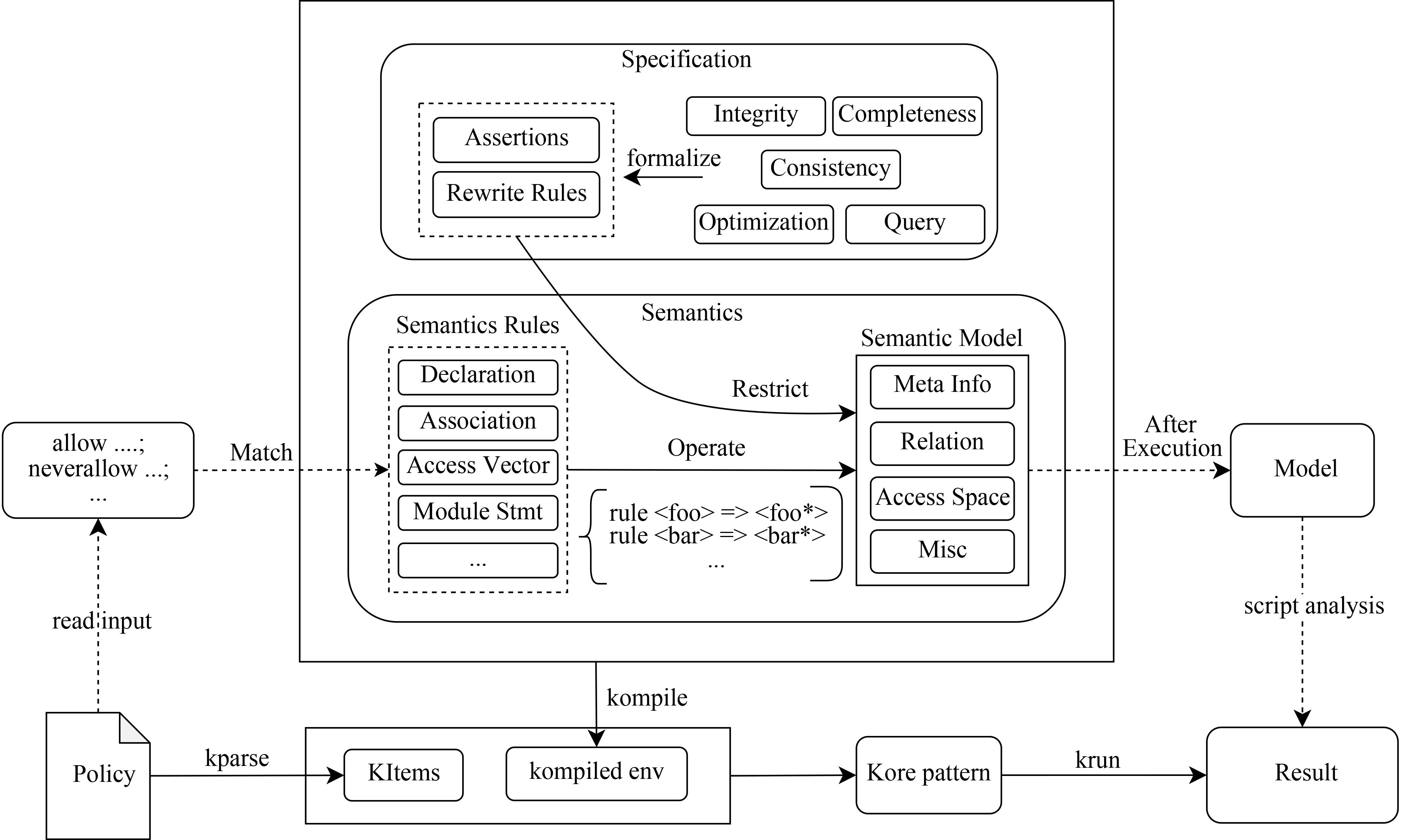 To address these issues, we have comprehensively formalized the semantics of the SELinux policy language in the framework. This approach provides a universal foundation for specifying various requirements, benefiting policy managers and policy tool developers. Furthermore, employing this approach, we have introduced a powerful tool named K-SELinux. This tool enables comprehensive analysis of SELinux policies, encompassing integrity, consistency, completeness, policy queries, policy optimization, and more. Notably, it provides excellent extensibility, enabling the seamless development of additional functions to address evolving needs.