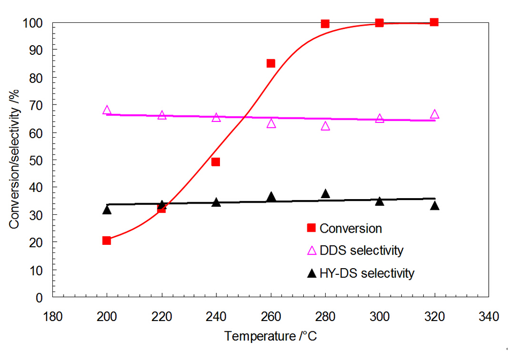 A one-step synthesized Ni-Mo-S catalyst supported on SiO2 was prepared and used for hydrodesulphurization (HDS) of dibenzothiophene (DBT), and 4,6-dimethyl-dibenzothiophene (4,6-DMDBT), and for hydrogenation of tetralin. The catalyst showed relatively high HDS activity with complete conversion of DBT and 4,6-DMDBT at temperature of 280 °C and a constant pressure of 435 psi. The HDS conversions of DBT and 4,6-DMDBT increased with increasing temperature and pressure, and decreasing liquid hourly space velocity (LHSV). The HDS of DBT proceeded mostly through the direct desulphurization (DDS) pathway whereas that of 4,6-DMDBT occurred mainly through the hydrogenation-desulphurization (HYD) pathway. Although the catalyst showed up to 24% hydrogenation/dehydrogenation conversion of tetralin, it had low conversion and selectivity for ring opening and contraction due to the competitive adsorption of DBT and 4,6-DMDBT and insufficient acidic sites on the catalyst surface.