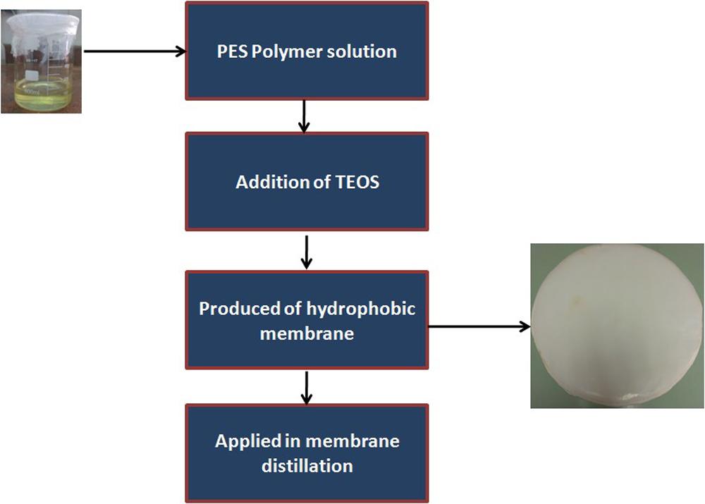 Membrane distillation (MD) is a thermal, vapor-driven transportation process through micro porous hydrophobic membranes that is increasingly being applied to seawater and brine desalination processes. Two types of hydrophobic microporous polyethersulfone flat sheet membranes, namely, annealed polyethersulfone and a polyethersulfone/tetraethoxysilane (PES/TEOS) blend were prepared by a phase inversion process. The membranes were characterized and their performances were investigated using the vacuum membrane distillation of an aqueous NaCl solution. The performances of the prepared membranes were also compared with two commercially available hydrophobic membranes, polytetrafluorethylene and polyvinylidene fluoride. The influence of operational parameters such as feed temperature (25–65 °C), permeate vacuum pressure (200–800 mbar), feed flow rate (8–22 mL/s) and feed salt concentration (3000 to 35000 mg/L) on the MD permeation flux were investigated for the four membranes. The hydrophobic PES/TEOS membrane had the highest salt rejection (99.7%) and permeate flux (86 kg/m2·h) at 65 °C, with a feed of 7000 ppm and a pressure of 200 mbar.