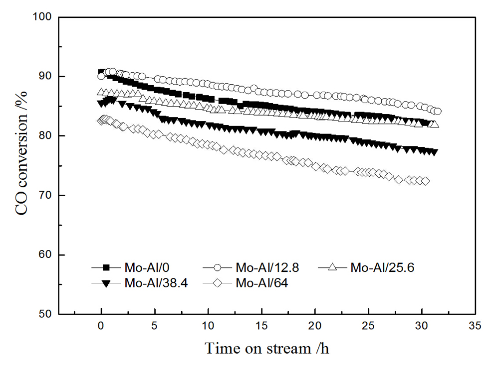 A series of unsupported MoS2 catalysts with or without Al2O3 modification was prepared using a modified thermal decomposition approach. The catalysts were tested for the methanation of carbon monoxide and the optimum one has 25.6 wt-% Al2O3 content. The catalysts were characterized by nitrogen adsorption measurement, X-ray diffraction and transmission electron microscopy. The results show that adding appropriate amount of Al2O3 increases the dispersion of MoS2, and the increased interaction force between MoS2 and Al2O3 can inhibit the sintering of active MoS2 to some extent.