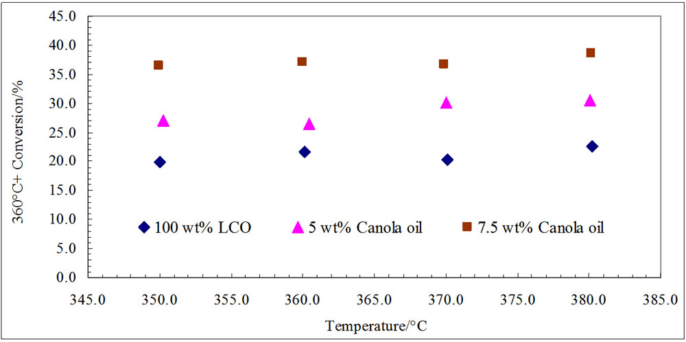 Canola oil and light cycle oil (LCO) blends were co-hydrotreated over a commercial hydrotreating catalyst (NiMo/Al2O3) to produce diesel fuel with a green diesel component. High hydrodeoxygenation, hydrodesulphurization and hydrodenitrogenation catalytic activities were achieved for all three feedstocks tested in the temperature range of 350–380 °C with a hydrogen pressure of 7 MPa and a gas/oil ratio of 800 nL/L. The hydrocracking conversion of the 360 °C+ materials in the feedstocks increased by 5% and 15% when 5 and 7.5 wt-% canola oil was added to the LCO, respectively. Compared to the pure LCO, the cetane index of the diesel product formed from hydrotreating the two canola oil-LCO blends increased by 2.5 and 4, respectively. Due to the higher hydrogen requirement to crack and deoxygenate the triglycerides contained in the canola oil, a higher hydrogen consumption was needed to hydrotreat the canola oil-LCO blends.