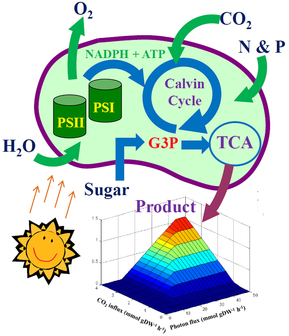 Cyanobacterium offers a promising chassis for phototrophic production of renewable chemicals. Although engineered cyanobacteria can achieve similar product carbon yields as heterotrophic microbial hosts, their production rate and titer under photoautotrophic conditions are 10 to 100 folds lower than those in fast growing E. coli. Cyanobacterial factories face three indomitable bottlenecks. First, photosynthesis has limited ATP and NADPH generation rates. Second, CO2 fixation by ribulose-1,5-bisphosphate carboxylase/oxygenase (RuBisCO) has poor efficiency. Third, CO2 mass transfer and light supply are deficient within large photobioreactors. On the other hand, cyanobacteria may employ organic substrates to promote phototrophic cell growth, N2 fixation, and metabolite synthesis. The photo-fermentations show enhanced photosynthesis, while CO2 loss from organic substrate degradation can be reused by the Calvin cycle. In addition, the plasticity of cyanobacterial pathways (e.g., oxidative pentose phosphate pathway and the TCA cycle) has been recently revealed to facilitate the catabolism. The use of cyanobacteria as “green E. coli” could be a promising route to develop robust photo-biorefineries.
