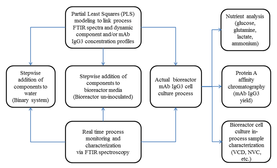 Compared to small molecule process analytical technology (PAT) applications, biotechnology product PAT applications have certain unique challenges and opportunities. Understanding process dynamics of bioreactor cell culture process is essential to establish an appropriate process control strategy for biotechnology product PAT applications. Inline spectroscopic techniques for real time monitoring of bioreactor cell culture process have the distinct potential to develop PAT approaches in manufacturing biotechnology drug products. However, the use of inline Fourier transform infrared (FTIR) spectroscopic techniques for bioreactor cell culture process monitoring has not been reported. In this work, real time inline FTIR Spectroscopy was applied to a lab scale bioreactor mAb IgG3 cell culture fluid biomolecular dynamic model. The technical feasibility of using FTIR Spectroscopy for real time tracking and monitoring four key cell culture metabolites (including glucose, glutamine, lactate, and ammonia) and protein yield at increasing levels of complexity (simple binary system, fully formulated media, actual bioreactor cell culture process) was evaluated via a stepwise approach. The FTIR fingerprints of the key metabolites were identified. The multivariate partial least squares (PLS) calibration models were established to correlate the process FTIR spectra with the concentrations of key metabolites and protein yield of in-process samples, either individually for each metabolite and protein or globally for all four metabolites simultaneously. Applying the 2nd derivative pre-processing algorithm to the FTIR spectra helps to reduce the number of PLS latent variables needed significantly and thus simplify the interpretation of the PLS models. The validated PLS models show promise in predicting the concentration profiles of glucose, glutamine, lactate, and ammonia and protein yield over the course of the bioreactor cell culture process. Therefore, this work demonstrated the technical feasibility of real time monitoring of the bioreactor cell culture process via FTIR spectroscopy. Its implications for enabling cell culture PAT were discussed.