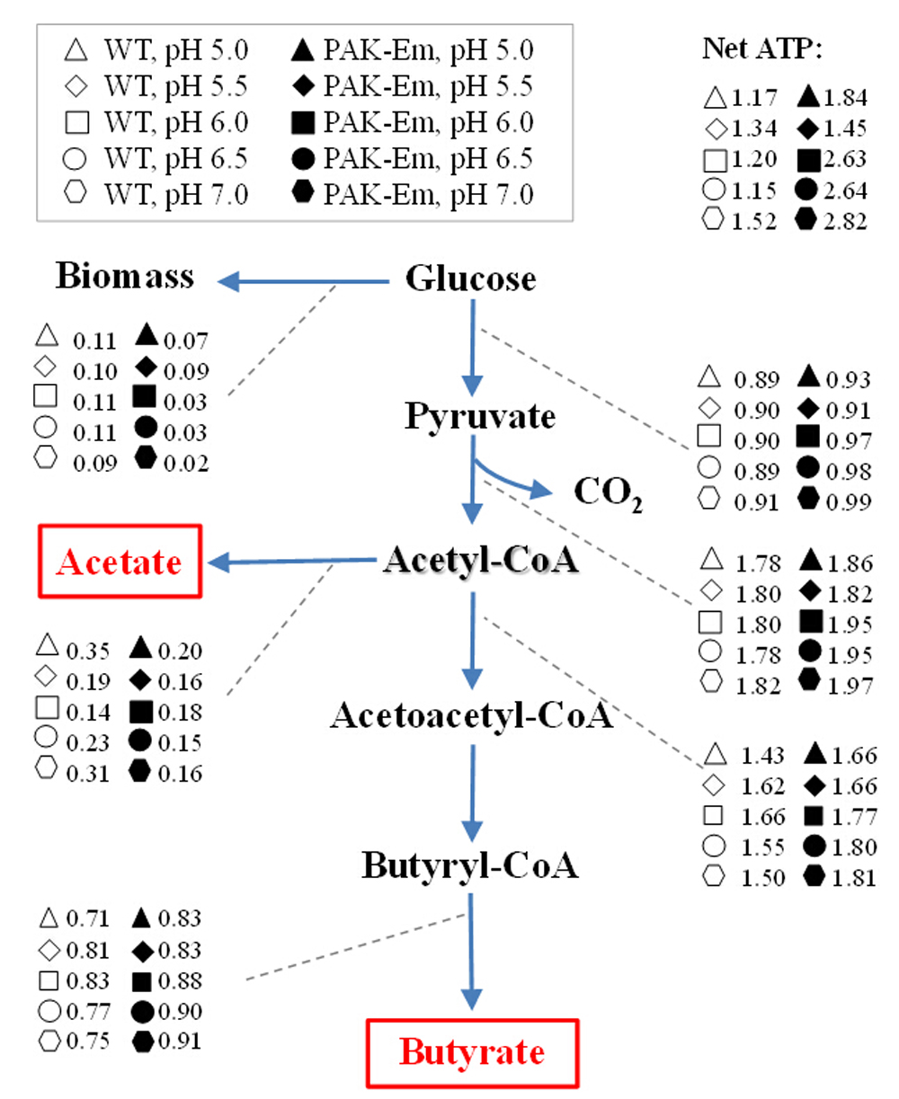 The objective of this study was to improve the production of butyric acid by process optimization using the metabolically engineered mutant of Clostridium tyrobutyricum (PAK-Em). First, the free-cell fermentation at pH 6.0 produced butyric acid with concentration of 38.44 g/L and yield of 0.42 g/g. Second, the immobilized-cell fermentations using fibrous-bed bioreactor (FBB) were run at pHs of 5.0, 5.5, 6.0, 6.5 and 7.0 to optimize fermentation process and improve the butyric acid production. It was found that the highest titer of butyric acid, 63.02 g/L, was achieved at pH 6.5. Finally, the metabolic flux balance analysis was performed to investigate the carbon rebalance in C. tyrobutyricum. The results show both gene manipulation and fermentation pH change redistribute carbon between biomass, acetic acid and butyric acid. This study demonstrated that high butyric acid production could be obtained by integrating metabolic engineering and fermentation process optimization.
