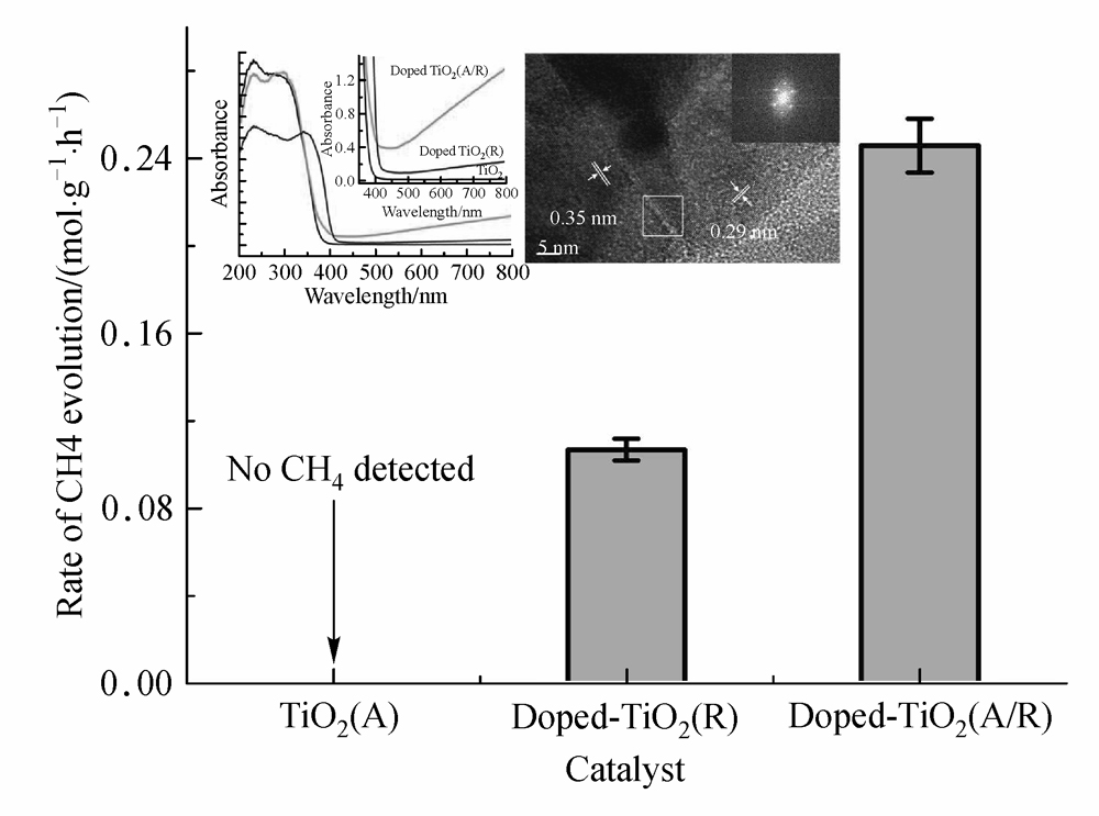 Ti3+-doped TiO2 nanosheets with tunable phase composition (doped TiO2 (A/R)) were synthesized via a hydrothermal method with high surface area anatase TiO2 nanosheets TiO2 (A) as a substrate, structure directing agent, and inhibitor; the activity was evaluated using a probe reaction-photocatalytic CO2 conversion to methane under visible light irradiation with H2 as an electron donor and hydrogen source. High-resolution transmission electron microscope (HRTEM), field emission scanning electron microscope, UV-Vis diffuse reflectance spectra, and X-ray diffraction (XRD) etc., were used to characterize the photocatalysts. XRD and HRTEM measurements confirmed the existence of anatase-rutile phase junction, while Ti3+ and single-electron-trapped oxygen vacancy in the doped TiO2 (A/R) photocatalyst were revealed byelectron paramagnetic resonance (EPR) measurements. Effects of hydrothermal synthesis temperature and the amount of added anatase TiO2 on the photocatalytic activity were elucidated. Significantly enhanced photocatalytic activity of doped TiO2 (A/R) was observed; under the optimized synthesis conditions, CH4 generation rate of doped TiO2 (A/R) was 2.3 times that of Ti3+-doped rutile TiO2.