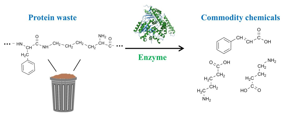 Protein-rich waste is an abundantly available resource that is currently used mainly as animal feed and fertilizers. Valorisation of protein waste to higher value products, particularly commodity chemicals such as precursors for polymers, has attracted significant research efforts. Enzyme-based approaches, being environmentally-friendly compared to their chemical counterparts, promise sustainable processes for conversion of protein waste to valuable chemicals. This review provides a general overview on valorisation of protein waste and then further summarises the use of enzymes in different stages of the valorisation process—protein extraction and hydrolysis, separation of individual amino acids and their ultimate conversion into chemicals. Case studies of enzymatic conversion are presented for different amino acids including glutamic acid, lysine, phenylalanine, tyrosine, arginine and aspartic acid. The review compares the different enzyme reactors and operation modes for amino acid conversion. The emerging opportunities and challenges in the field are discussed: engineering powerful enzymes and integrating innovative processes for industrial application at a low cost.