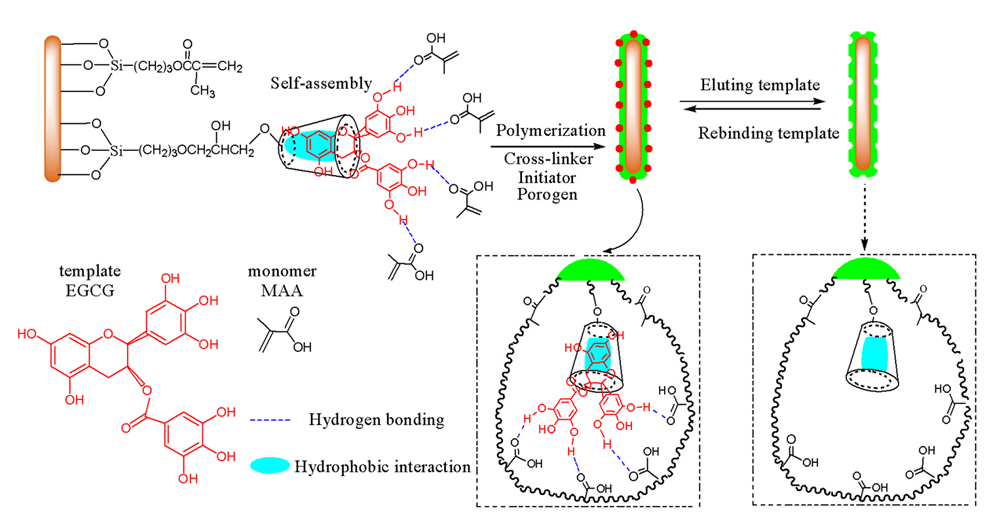 Surface molecularly imprinted polymers (SMIPs) have been synthesized to selectively determine (−)-epigallocatechin gallate in aqueous media. SMIPs were prepared using a surface grafting copolymerization method on a functionalized silica gel modified with β-cyclodextrin and vinyl groups. The morphology and composition of the SMIPs were investigated by scanning electron microscopy, Fourier transform-infrared spectroscopy and thermogravimetric analysis. In addition, the molecular binding capacity, recognition properties and selectivity of the SMIPs were evaluated. The imprinted polymers were found to have a highly specific recognition and binding capacity for (−)-epigallocatechin gallate in aqueous media which is the result of the hydrophobic properties of the β-cyclodextrin and the hydrogen-bonding interactions of methacrylic acid. The SMIPs were successfully employed as solid-phase extraction adsorbents prior to the HPLC determination of (−)-epigallocatechin gallate in toothpaste. The HPLC analysis had a linear dynamic range of 0.5–50.0 µg⋅mL−1 with a correlation coefficient of 0.9998 and the recoveries ranged from 89.4% to 97.0% with relative standard deviations less than 4.8%. The limit of detection and limit of quantification were 0.17 and 0.33 µg⋅mL−1, respectively. The method provides a promising approach for the preparation of selective materials for the purification and determination of complex samples.