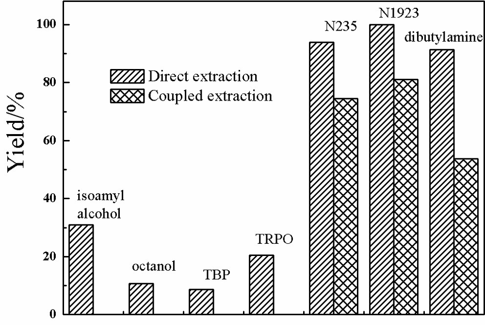 A coupled reaction-solvent extraction process was used to remove HCl from a simulated distiller waste. The extraction performances of various extractants and diluents were compared and the apparent basicity of N235 (a mixture of tertiary amines) in various diluents was determined. The best results were obtained using N235 and isoamyl alcohol as the extractant and diluent, respectively. The yield of HCl from the coupled extraction was 75% with this extraction system. The mechanisms for the removal of HCl in both the direct and coupled extractions were investigated. For the coupled extraction, the formation of an R3NHCl ion-pair complex was involved in the HCl removal. For the direct extraction, the mechanism involved the formation of hydrogen bonds at high concentrations of HCl.