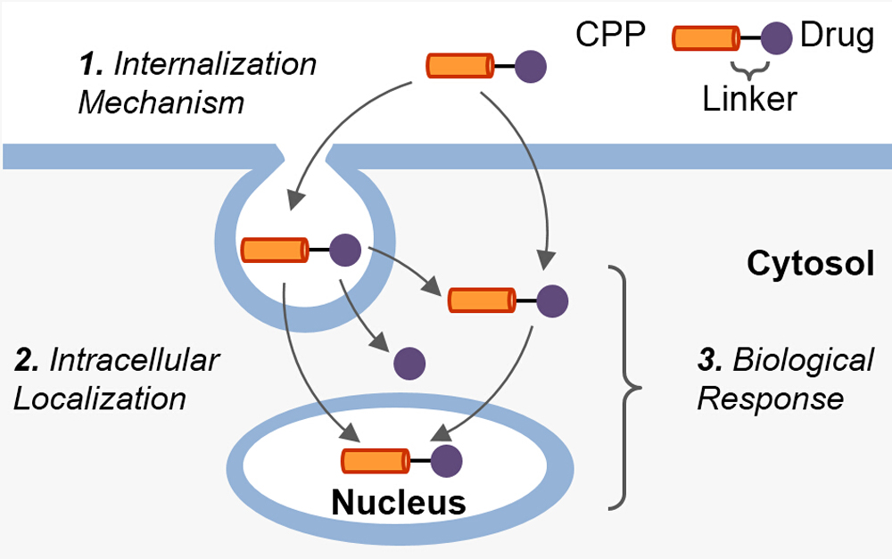 Over the past few decades, cell penetrating peptides (CPPs) have become an important class of drug carriers for small molecules, proteins, genes and nanoparticle systems. CPPs represent a very diverse set of short peptide sequences (10‒30 amino acids), generally classified as cationic or amphipathic, with various mechanisms in cellular internalization. In this review, a more comprehensive assessment of the chemical structural characteristics, including net cationic charge, hydrophobicity and helicity was assembled for a large set of commonly used CPPs, and compared to results from numerous in vivo drug delivery studies. This detailed information can aid in the design and selection of effective CPPs for use as transport carriers in the delivery of different types of drug for therapeutic applications.