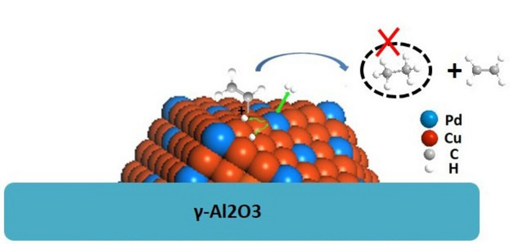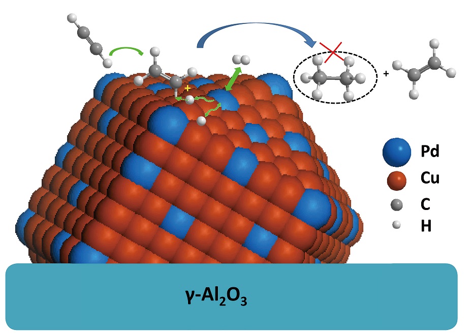 Galvanic replacement, co-impregnation and sequential impregnation have been employed to prepare Pd-Cu bimetallic catalysts with less than 1 wt-% Cu and ca. 0.03 wt-% Pd for selective hydrogenation of acetylene in excess ethylene. High angle annular dark field-scanning transmission electron microscopy (HAADF-STEM) and H2 chemisorption results confirmed that Pd-Cu single-atom alloy structures were constructed in all three bimetallic catalysts. Catalytic tests indicated that when the conversion of acetylene was above 99%, the selectivity of ethylene of these three single atom alloy catalysts was still more than 73%. Furthermore, the single atom alloy catalyst prepared by sequential incipient wetness impregnation was found to have the best stability among the three procedures used.